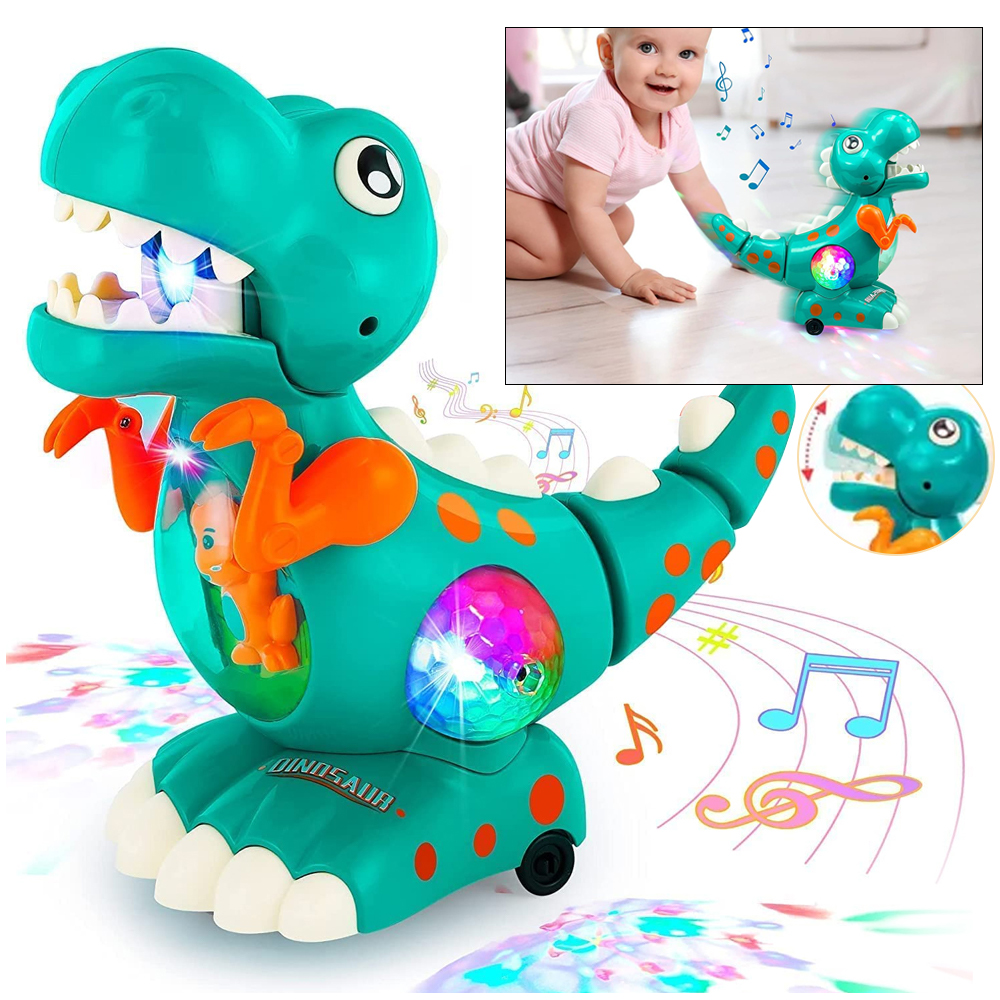 - Пасть динозавра открывается и закрывается во время ходьбы, имитируя рев. Его руки и хвост покачиваются в ритме света и музыки, побуждая ребенка гоняться, играть и ползать, что помогает развивать его моторику.
