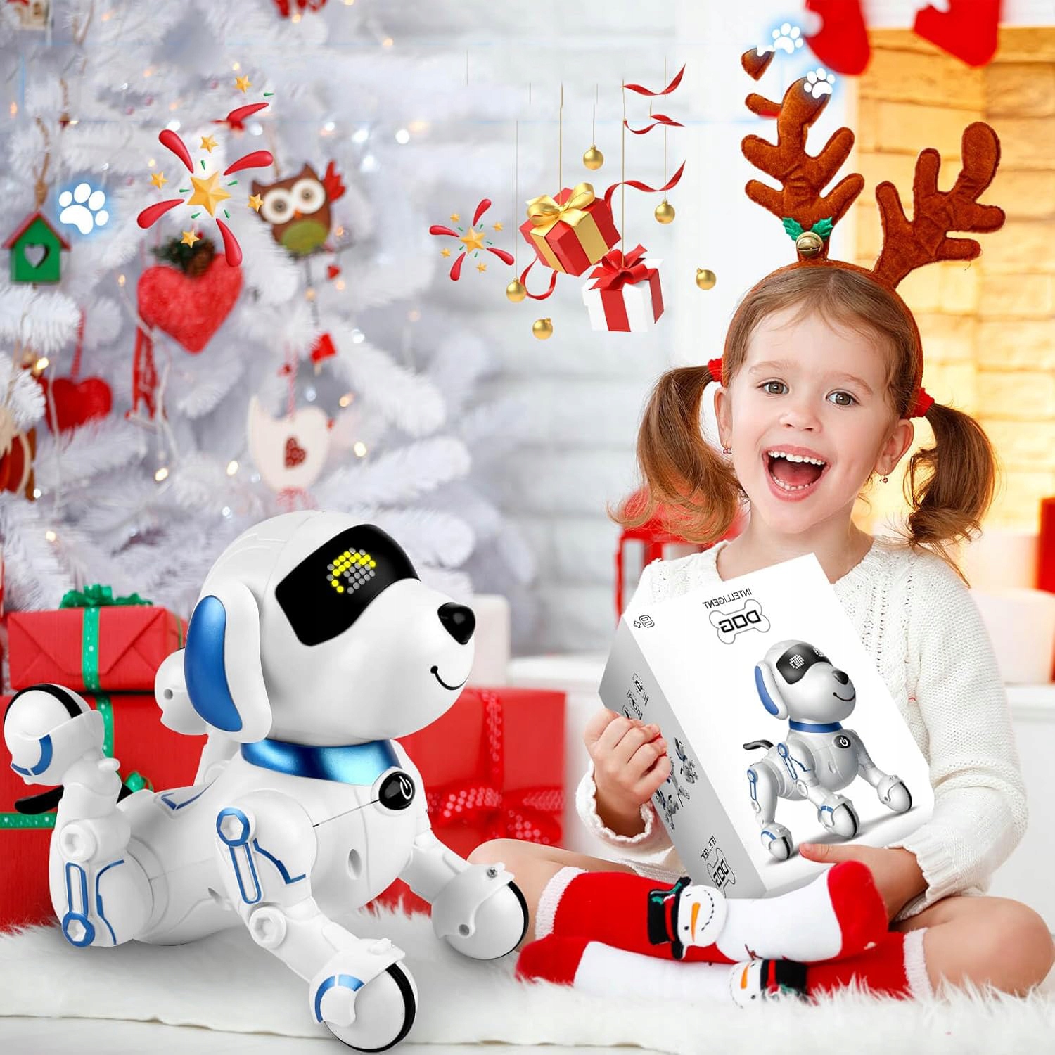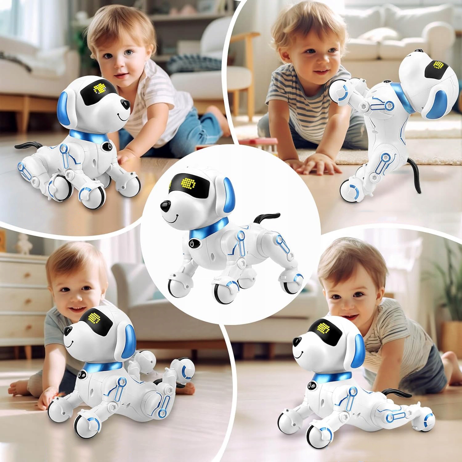 - Наш умный робот-собака — многофункциональный компаньон в обучении, который может рассказывать истории, петь стишки, танцевать, учить английский язык и имитировать 6 различных звуков животных, предоставляя детям разнообразные образовательные и развлекательные возможности.