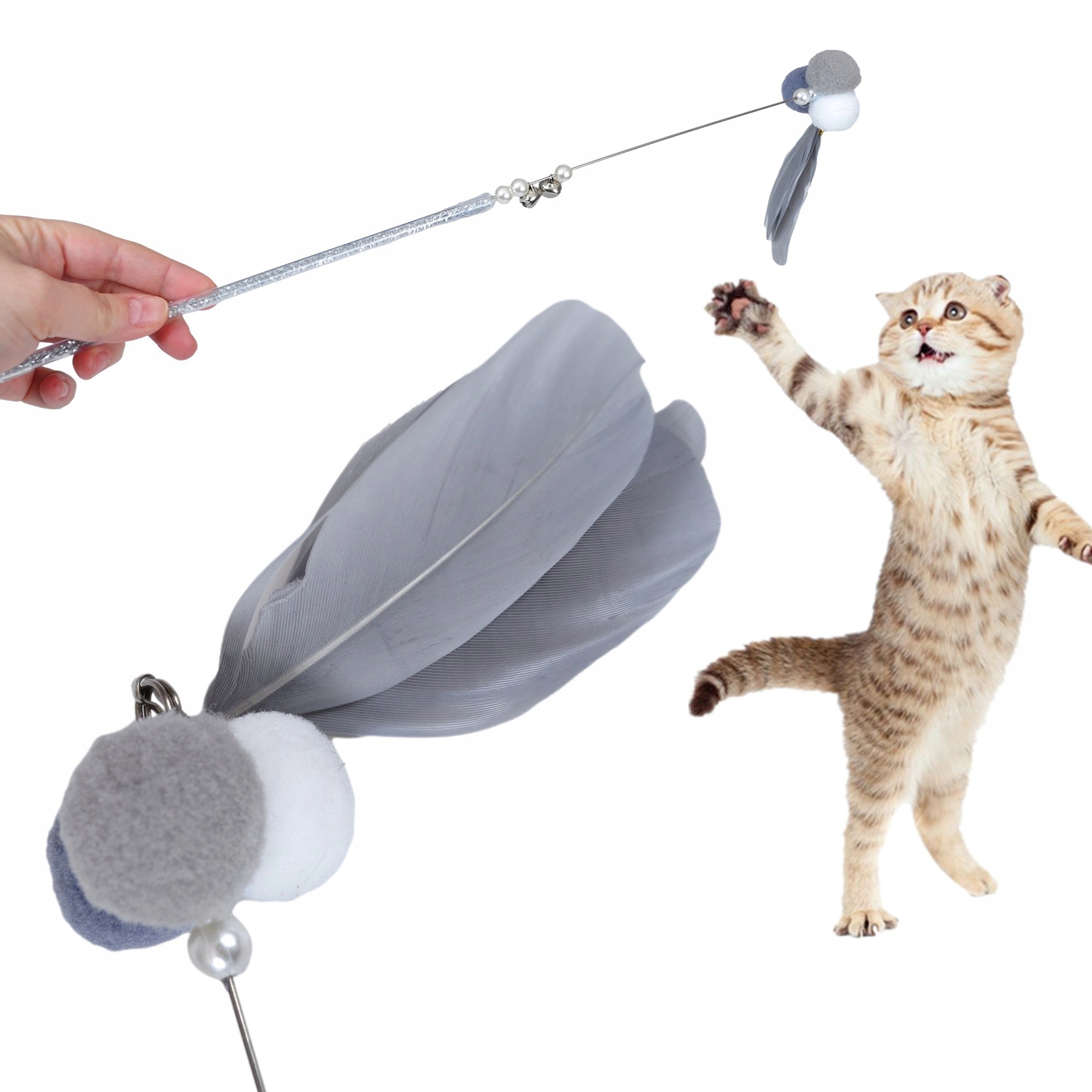 ИГРУШКА ДЛЯ КОШКИ ПОМПОНЫ ПЕРЬЯ РЫБАЛКА УДОЧКА 45 СМ