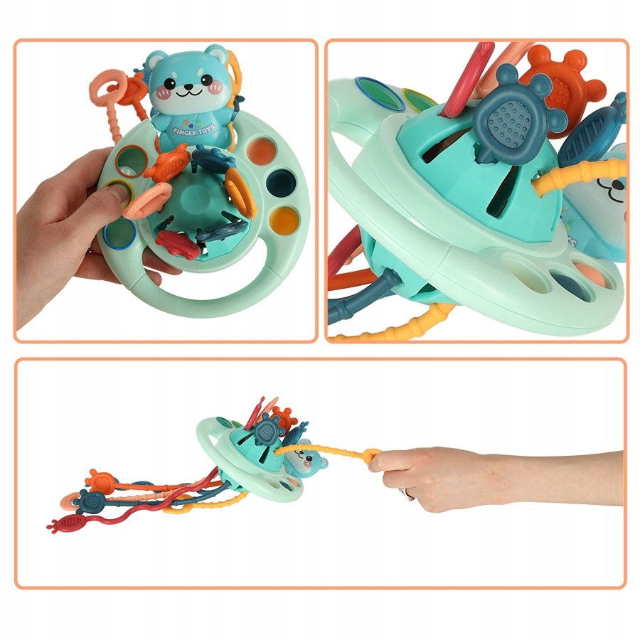 Игрушкой можно играть несколькими способами, благодаря нескольким элементам, которые она имеет - силиконовые струны, шарики для нажмите и колесо для перемещения. А когда тянуть за струны станет скучно или слишком сложно, их можно использовать в качестве прорезывателей!