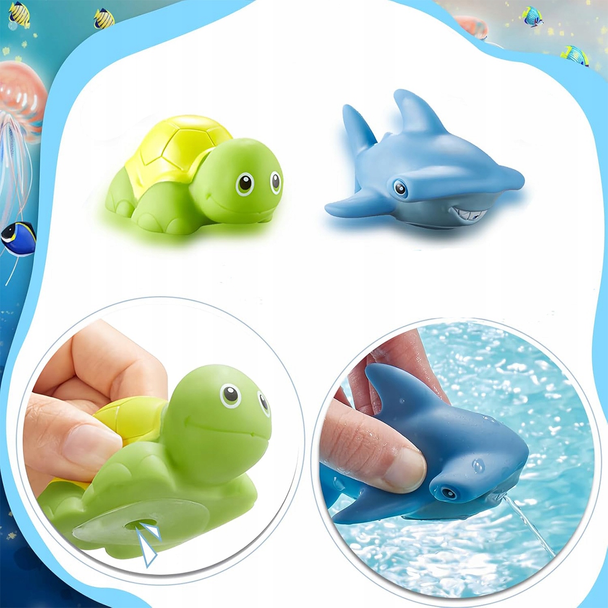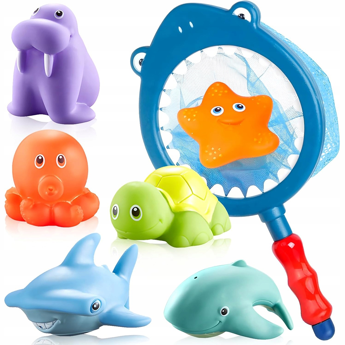 В комплект входят 7 игрушек для ванны с изображением морских существ: черепаха, морской лев, осьминог, морская звезда, акула, дельфин и рыболовная сеть, что позволит детям весело и активно купаться.