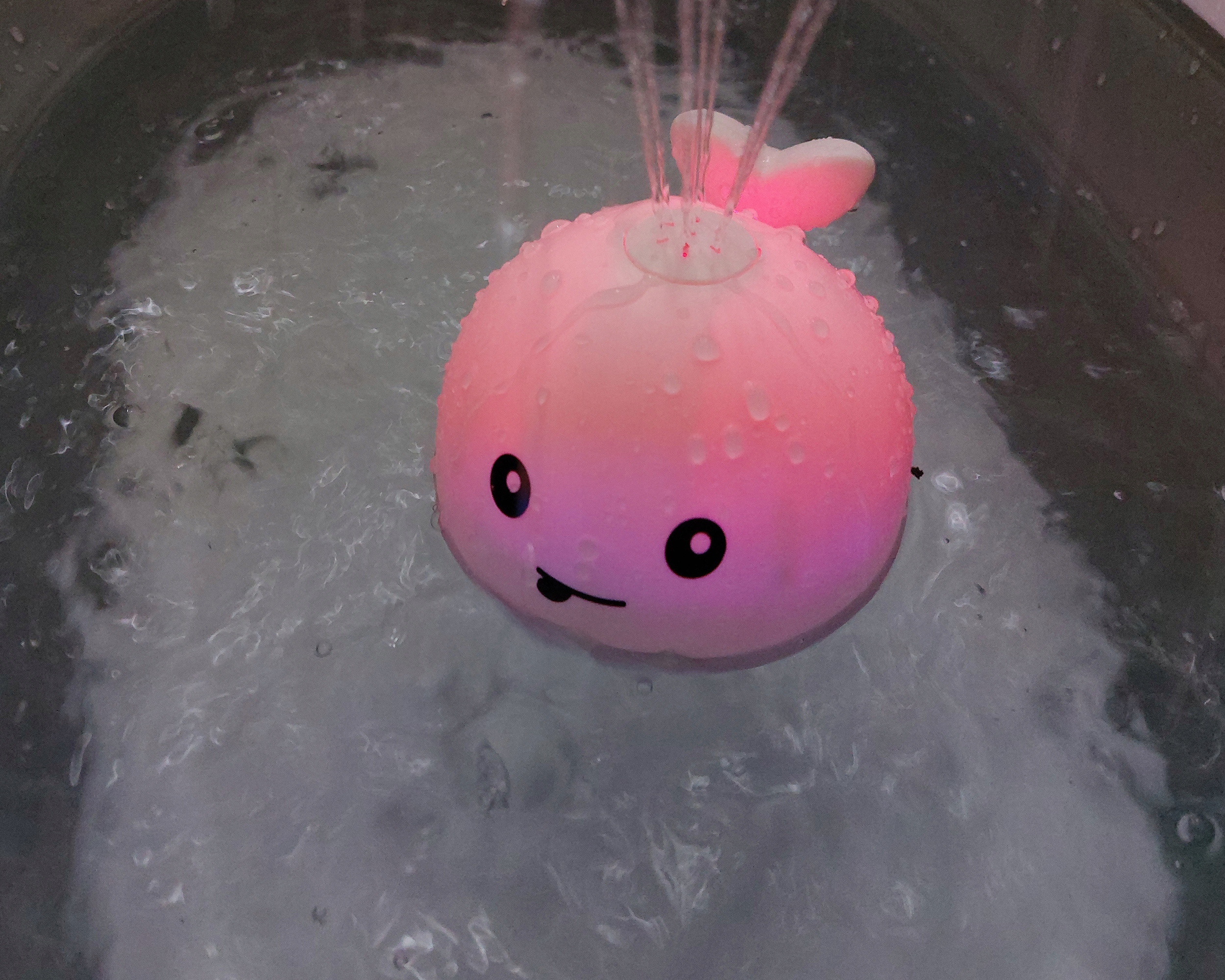 Светящийся кит, брызгающий водой, — отличная идея для оригинальной игры для купания вашего ребенка.