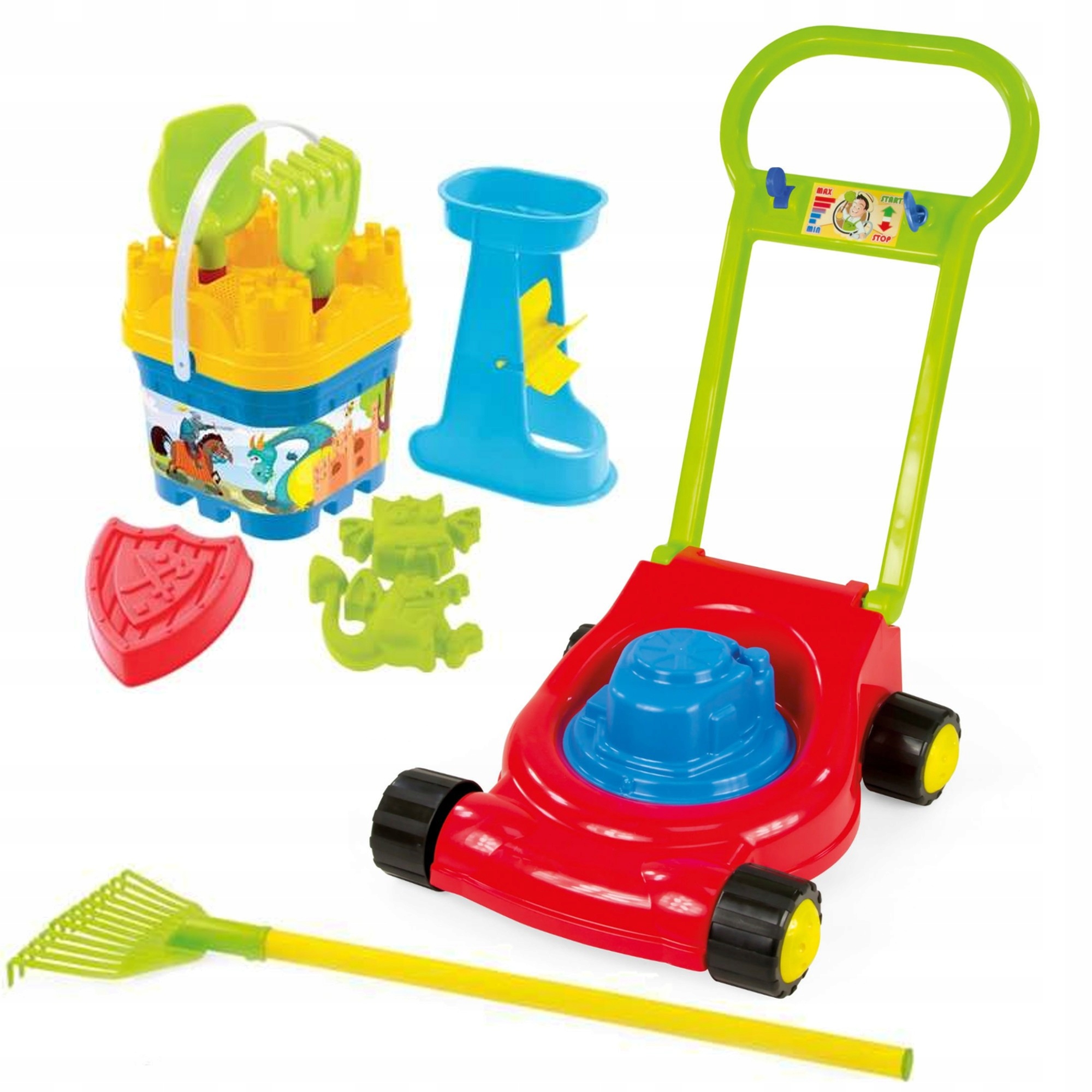 Игрушечная газонокосилка + садовые инструменты грабли + набор песка "замок"
