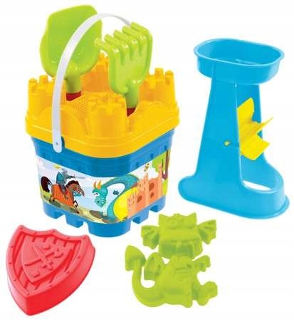 Замок из песка с аксессуарами состоит из синеговедра с изображением дракона, рыцаря и замка. Ведро имеет крышку с отверстиями специально для размещения лопаты и граблей. Дополнительно в набор входят 2 песочные формы и шлифовальная машинка.