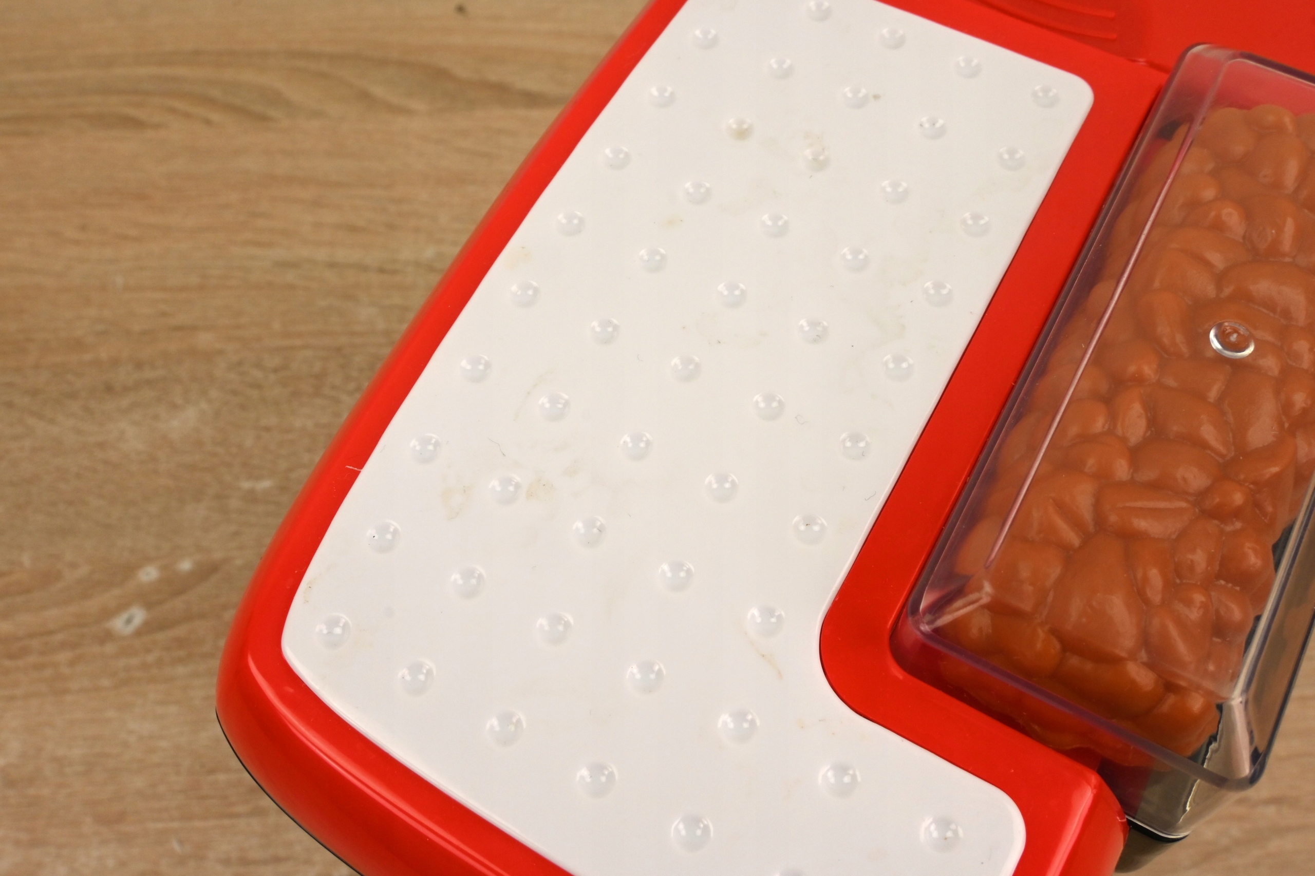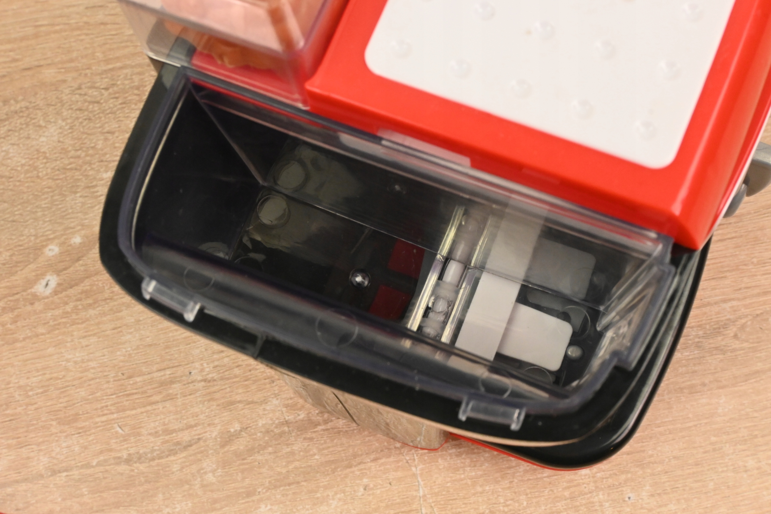 Набор состоит из черной кофемашины с красной чашкой, подвижного капучинатора, контейнера для кофе и резервуара для воды с индикатором порции.