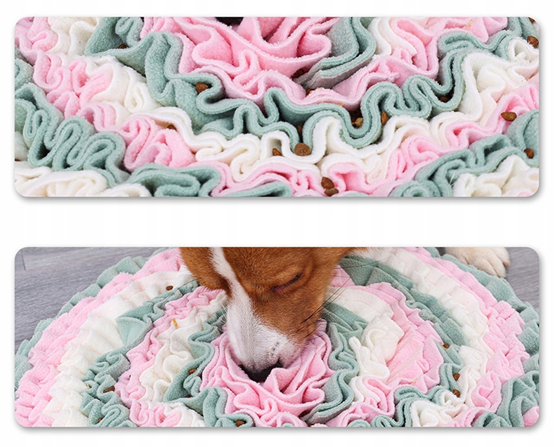 Он будет обнюхивать и искать спрятанные деликатесы в укромных уголках коврика. Коврик плотно сшит из полосок мягкого флиса.