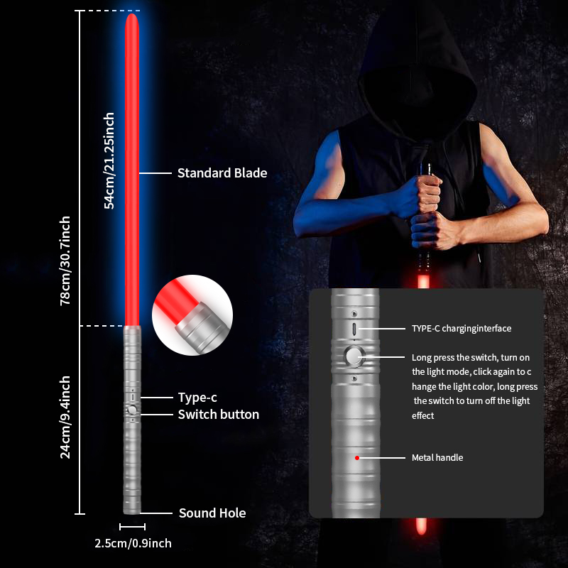 Световые мечи соответствуют игрушечным стандартам и подходят для детей старше 3 лет. Рукоятка изготовлена из высококачественного алюминиевого сплава, а лезвие — из высокопрочного и прозрачного поликарбоната.