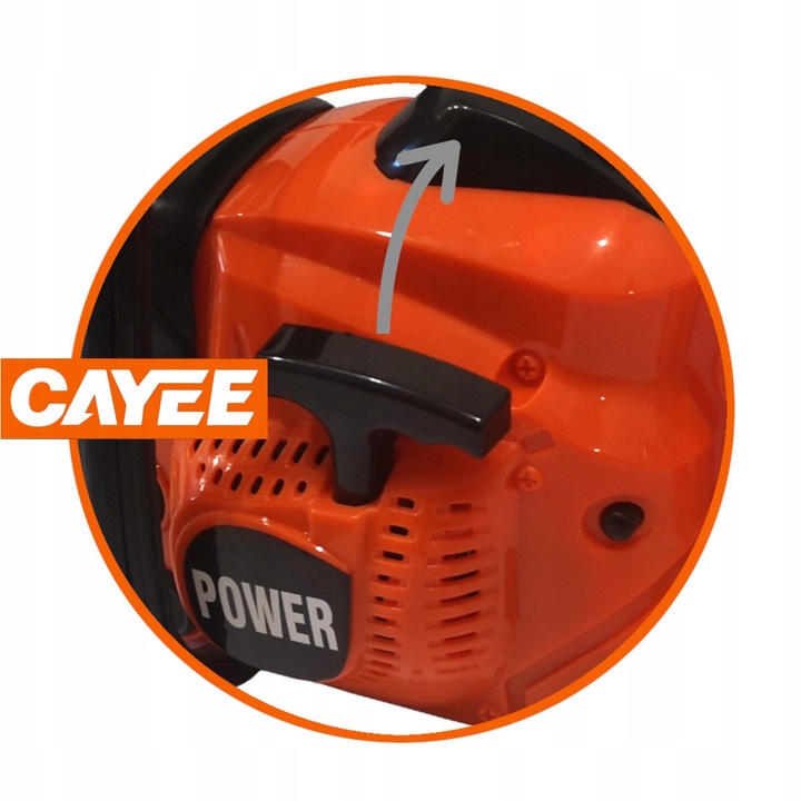 Пила запускается с помощью пускового съемника, расположенного с левой стороны. При запуске пила издает звук запуска настоящей моторной пилы. После запуска все еще слышен звук настоящей моторной пилы, работающей на малых оборотах.