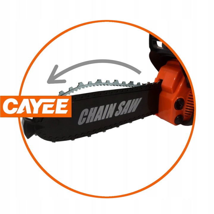 При нажатии на газ резиновая цепь начинает вращаться, как в настоящей мотопиле. Цепь имеет защиту от порезов. Когда цепочка чувствует сопротивление, она перестает вращаться, защищая ребенка.