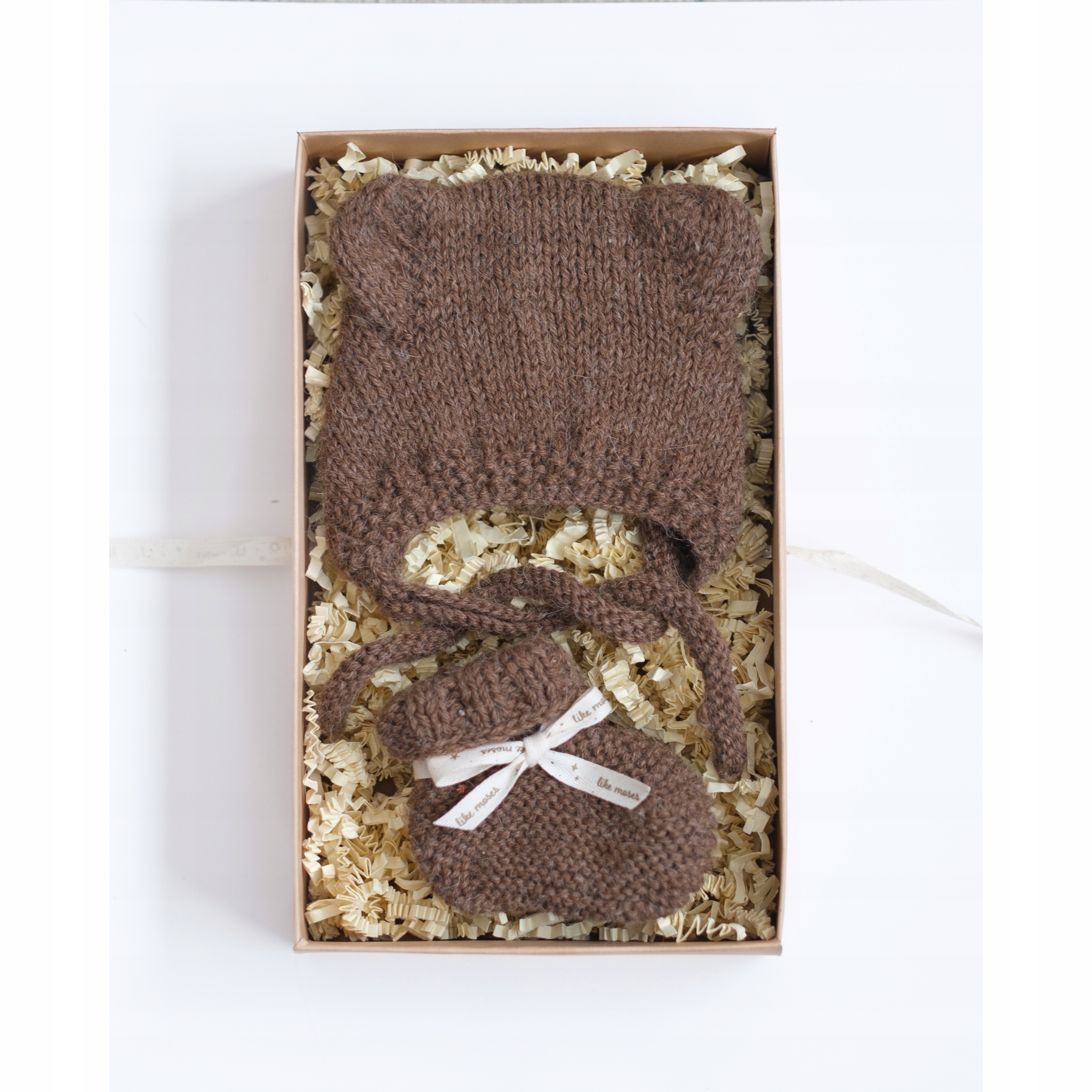 Представленный набор станет прекрасным подарком на детский праздник, рождение ребенка или праздники. Шапка и туфли упакованы в коробку натурального коричневого цвета, наполненную бумажной стружкой, перевязанную декоративной лентой.