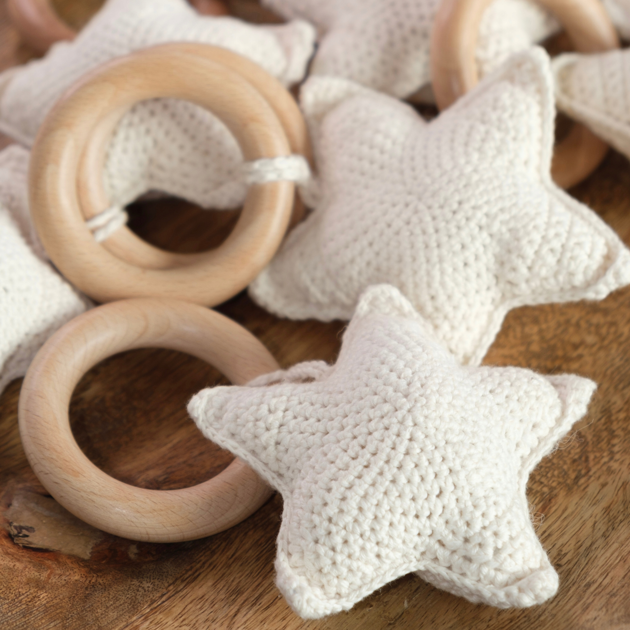 Звезды связаны крючком из 100% хлопковой пряжи – натурального, сертифицированного материала, не содержащего вредных веществ. Подвешивается на деревянное кольцо диаметром 7 см.