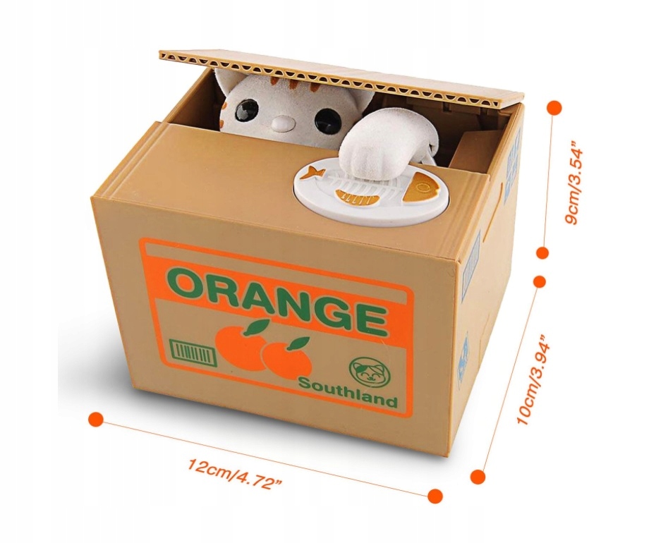 Просто поместите монету в назначенное место. . Кот будет тайком брать по одной монете, благодаря в ответ. В кошачьей шкатулке вора вмещается около 40 монет. Внизу коробки есть крышка, которую можно открыть, чтобы вернуть все сэкономленные деньги!