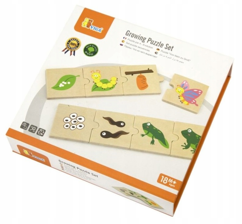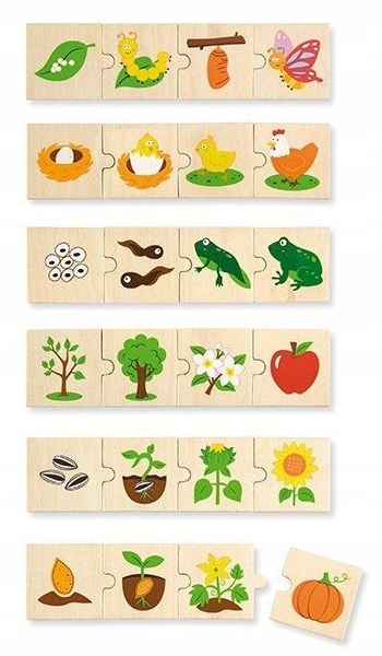 Развивающие пазлы познакомят вашего малыша с миром интересной и удивительной природы. Собирание этих головоломок — отличное введение в познание окружающего нас мира. Малыш узнает этапы развития известных растений, животных и насекомых, с которыми он сталкивается каждый день. Пазл предназначен для развития у детей памяти, навыков анализа и критического мышления. В комплекте 24 деревянных пазла, раскрашенных безопасными для детей красками.