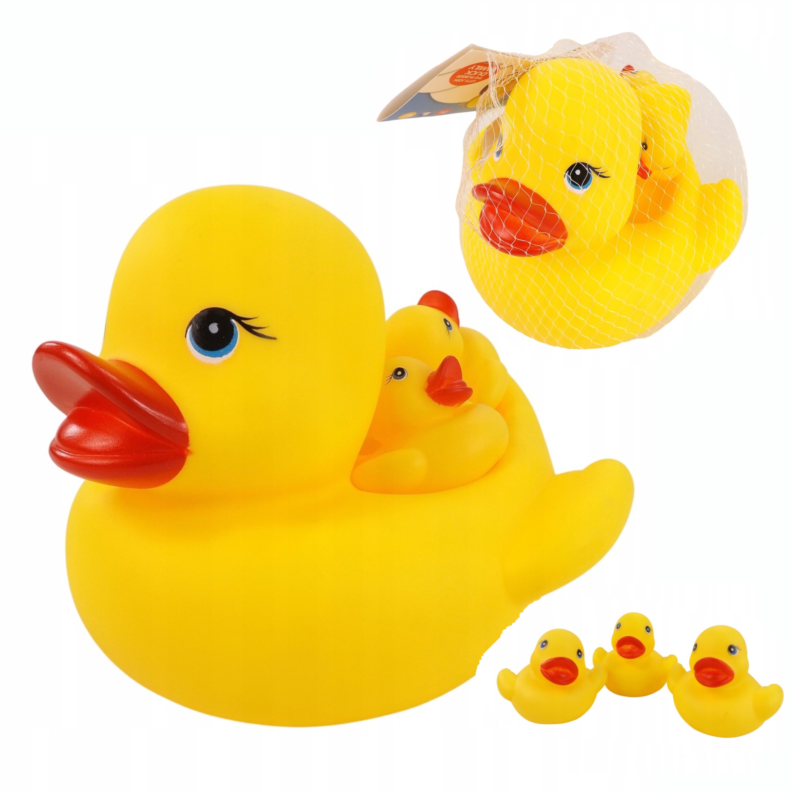 Утята резиновые, разных размеров. У нас есть мама-утка и трое утят. Поверхность большой утки плоская, ее можно использовать как мыльницу, а можно разместить на ней уток поменьше.