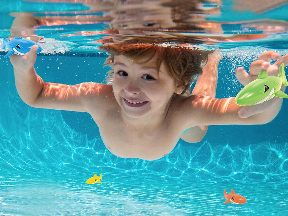 - Дайвинг после акул: распространять акул в бассейне или погрузить бассейн, они упадут на дно. Задача ребенка будет заключаться в том, чтобы вырывать их, что требует погружения под водой и контролем дыхания.