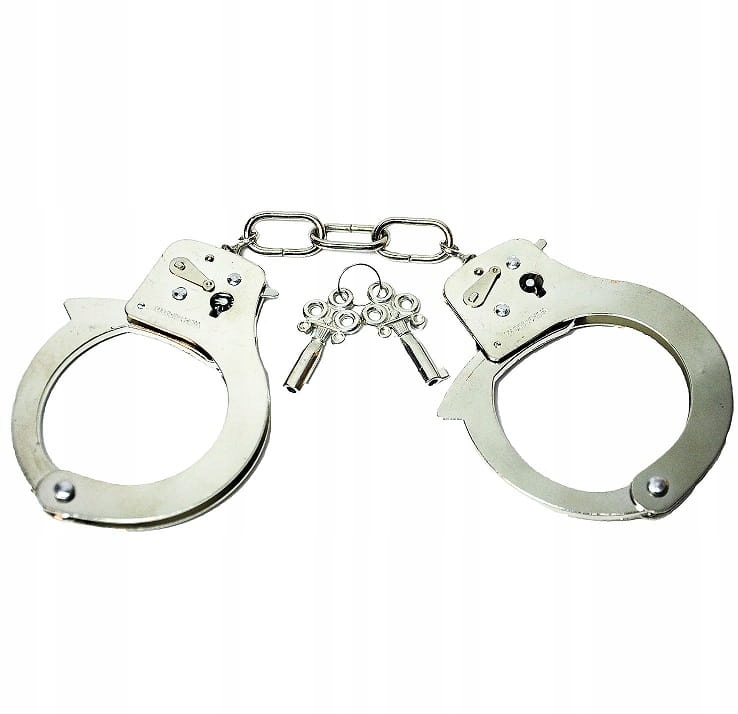 наручники, полностью изготовленные из металла, соединенного с цепью. Весь набор в серебре. они выглядят как настоящие наручники . Это надежный набор для игры в полицейского, и они также будут работать в качестве подарка для различных случаев