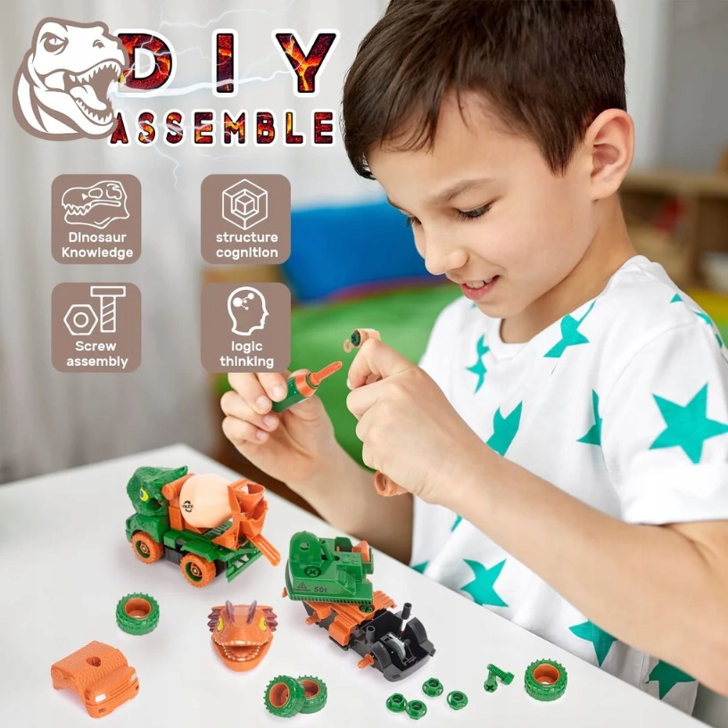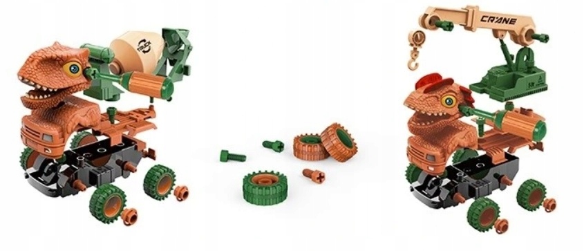 Супернабординозавров для мальчиков и девочек включает в себякран-динозавр, бетономешалка динозавра, два небольшие фигурки голов динозавров, колесиков, шурупов, отвертки. Легко переносить благодаря упаковке с ручкой.