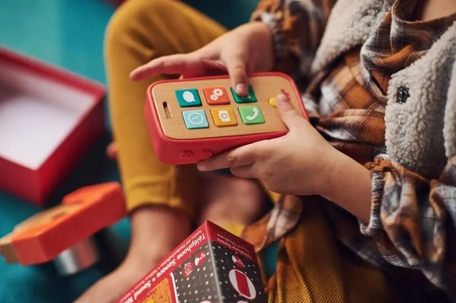 Деревянный мобильный телефон от французского бренда JANOD – прекрасный подарок маленькому поклоннику технологий. Он был очень эстетичен из бука, с вниманием ко всем деталям. Он имеет силиконовый корпус с отверстием динамика сзади, а спереди расположена круглая основная кнопка и 6 квадратных кнопок, имитирующих значки на экране и при нажатии издающих соответствующие звуки, характерные для «взрослых» телефонов: будильник, электронная почта, камера, настройки, мелодия звонка телефона, СМС и возврат на главный экран.
