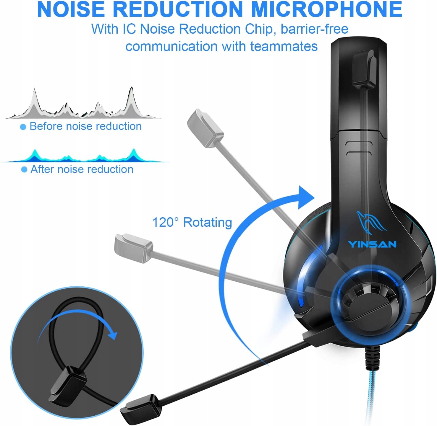 Игровая гарнитура YINSAN PS4, проводные наушники для PS4, Xbox One, ПК, PS5, мягкие накладные наушники с объемным басовым звуком, светодиодной подсветкой, регулировкой громкости и шумоизоляцией (удлинительный USB-кабель 5 футов в комплекте) )