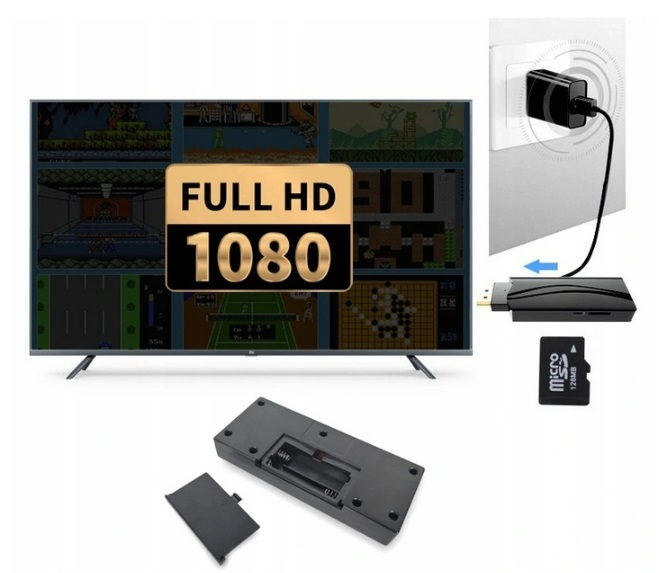 <р>1. Подключите прилагаемый кабель питания micro USB к консоли и порту USB на телевизоре или зарядном устройстве для смартфона. <р>2. Вставьте консоль в порт HDMI телевизора. <р>3. Телевизор должен автоматически обнаружить сигнал HDMI, в противном случае вам придется вручную выбрать источник сигнала HDMI в меню телевизора.