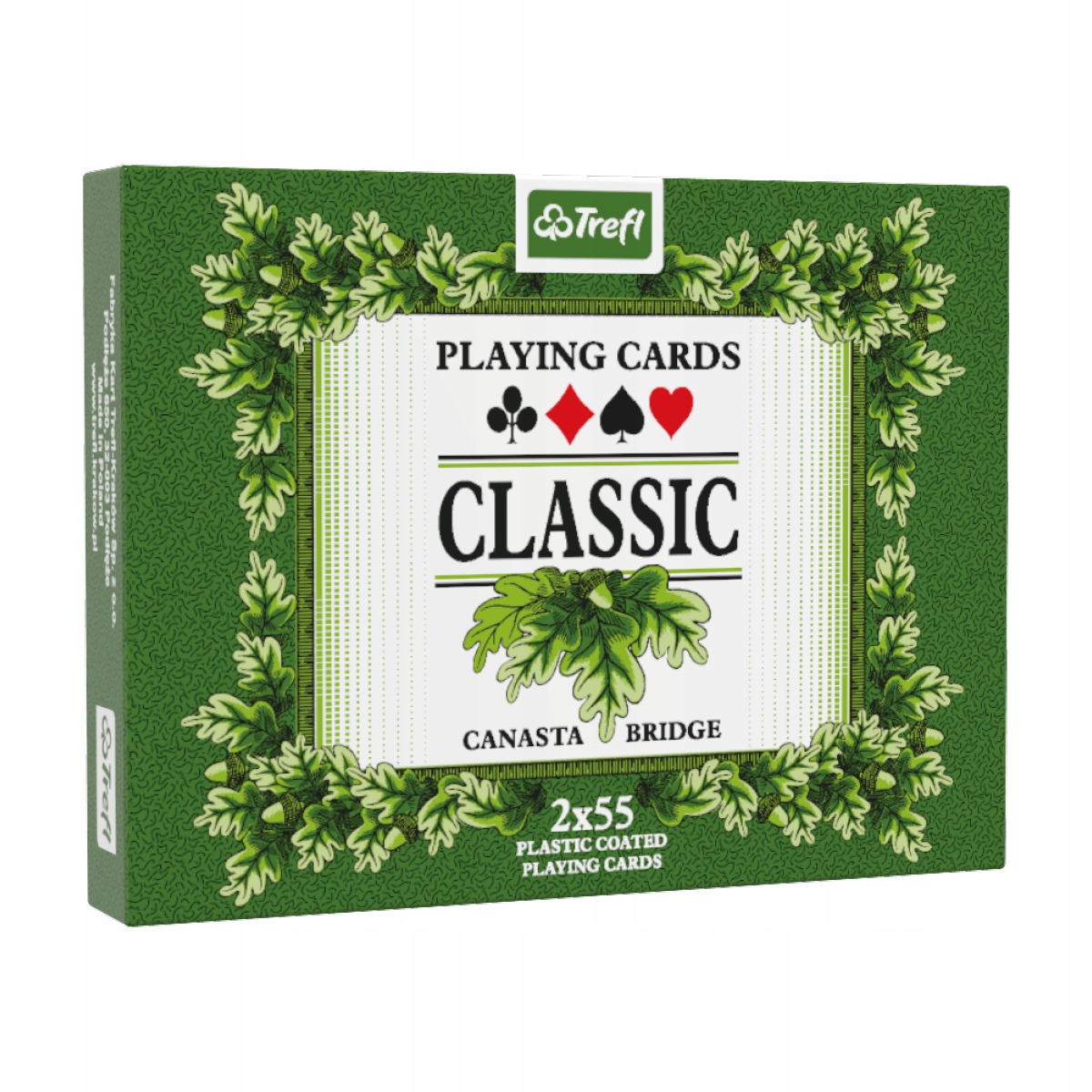 Classic - Classic Standard Cards - это модель, известная в Польше на протяжении десятилетий. Характерный янтарный и зеленый реверс украшены дубовыми листьями, а также фигуры и цвета, отмеченные международным рисунком. Карты подходят для всех типов классических карточных игр. Карты для игроков, которые любят классику в традиционном издании. Набор содержит 2 палуба из 55 листьев карты