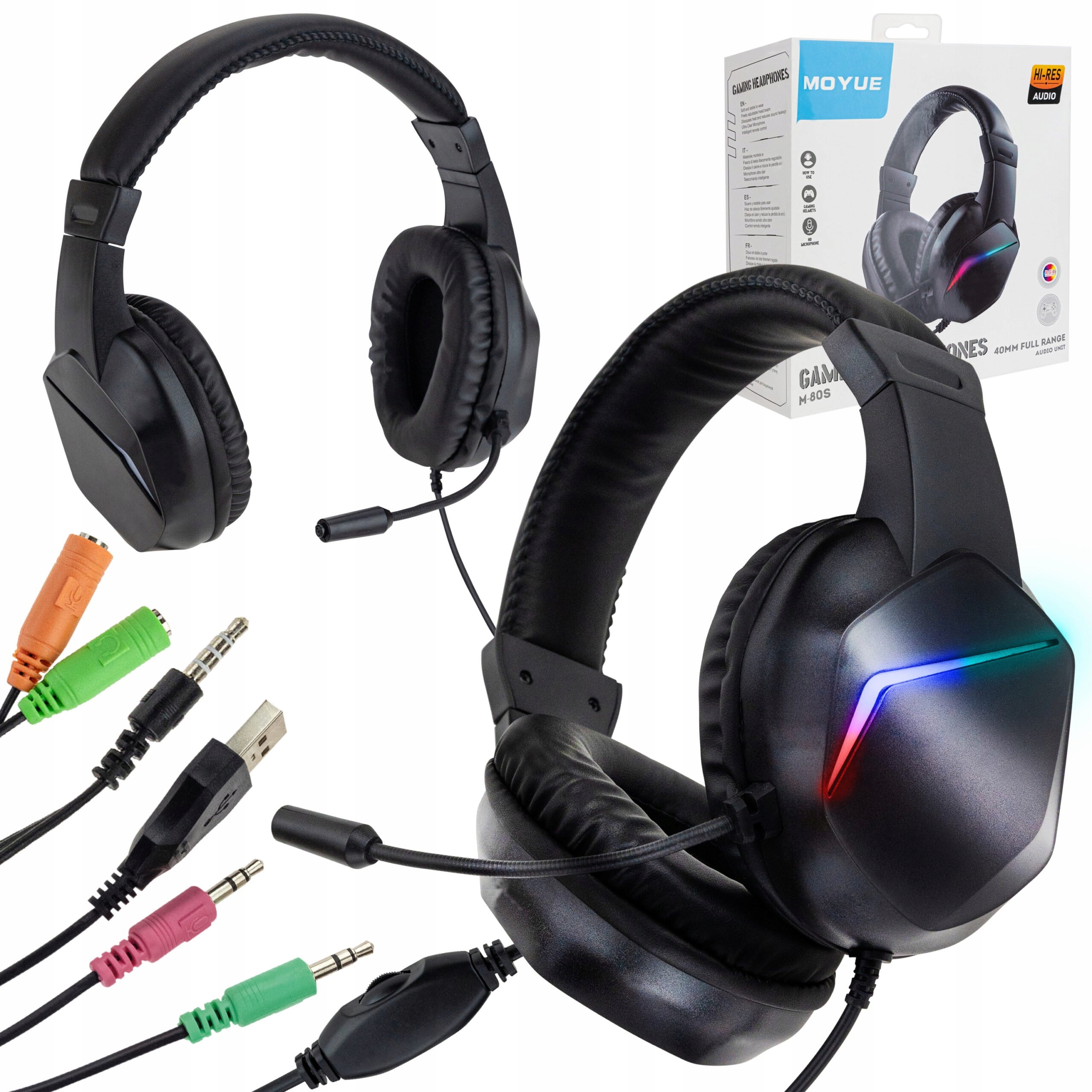 Это решение идеально подходит для ПК компьютера. На конце кабеля также имеется USB-разъем, который используется для питания подсветки корпуса. Плюсом наушников является регулируемая RGB подсветка. Подсветка необязательна, можно использовать оборудование без этой функции. В комплект входит кабель-сплиттер с разъемом 3,5 мм.