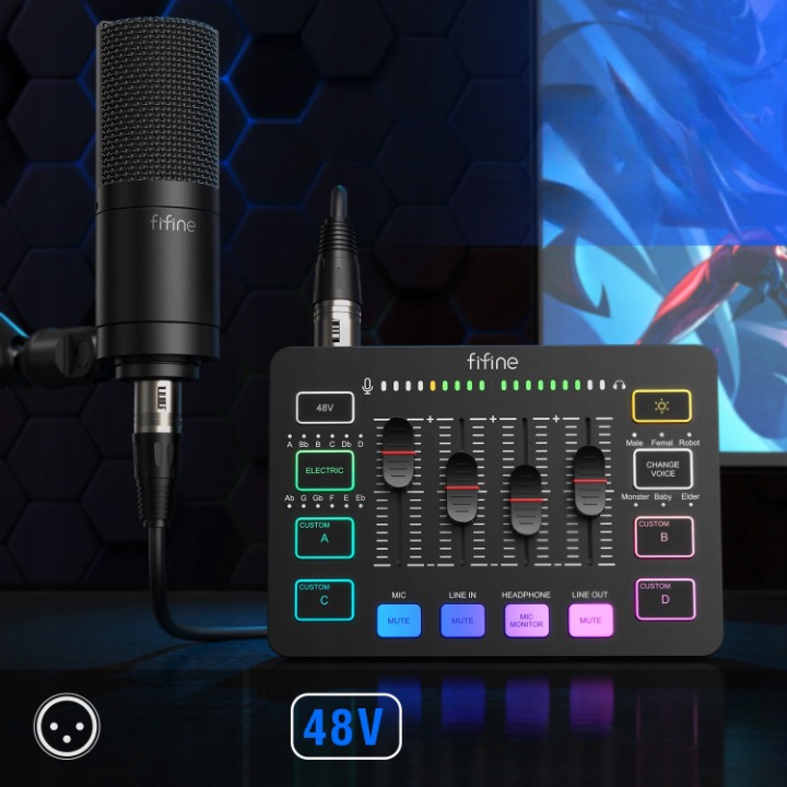 Аудиомикшер FIFINE Gaming, потоковый микшер RGB для ПК с микрофонным интерфейсом XLR, индивидуальными элементами управления, регулятором громкости, кнопкой отключения звука, фантомным питанием 48 В, для подкастов, записи,