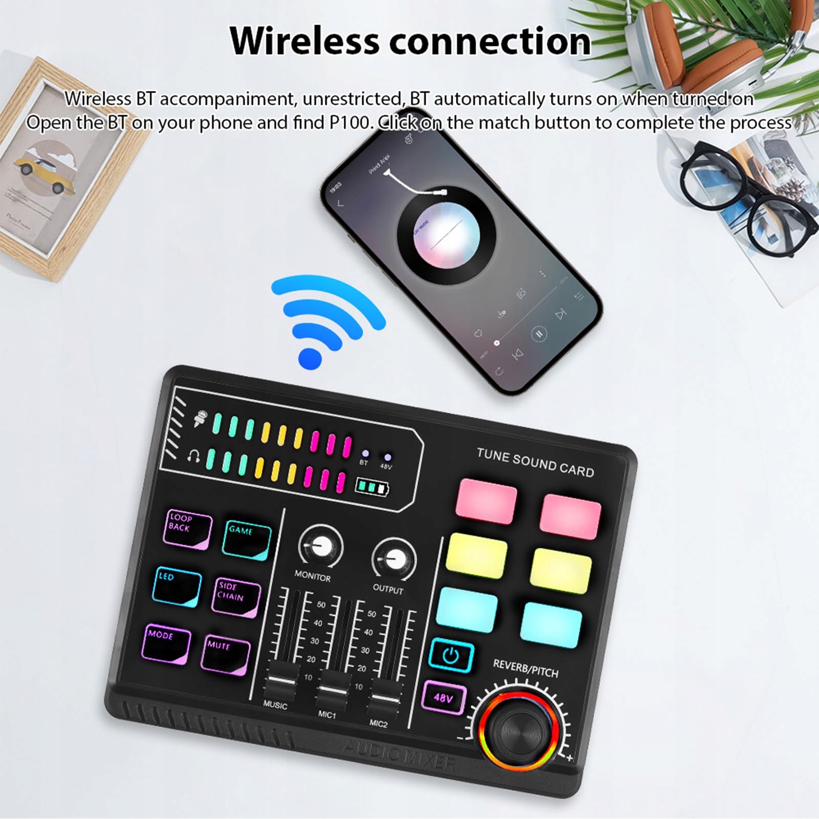 Игровой аудиомикшер, 48 В, фантомное питание, аудиоинтерфейс, RGB-подсветка, BT TR