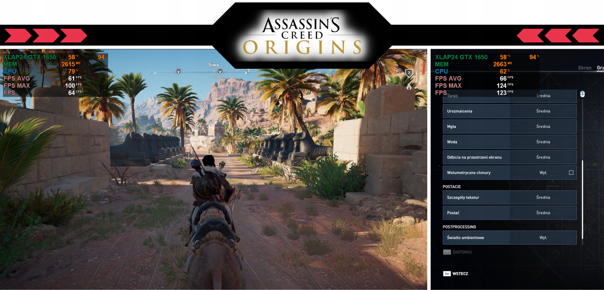 - Assassin's Creed Origins: разрешение Full HD, общие настройки графики на среднем уровне, средний FPS 61.