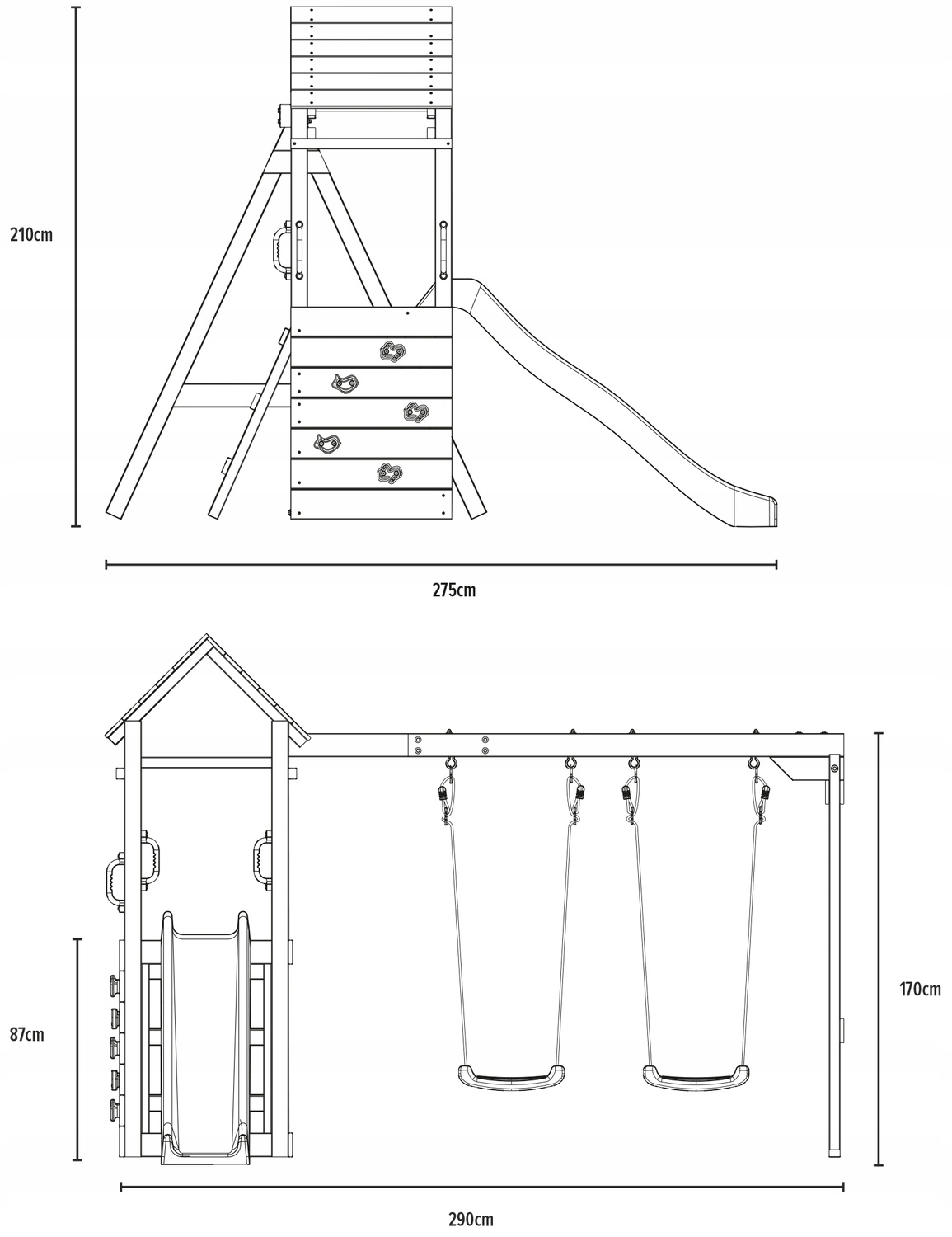 Деревянная игровая площадка чрезвычайно привлекательна визуально, что может побудить детей проводить время на свежем воздухе. Вы можете раскрасить его (безопасными для детей красками) в любой цвет! или декорировать каким-либо образом. Деревянная конструкция делает дом очень прочным и в то же время экологически чистым. Высокое качество материалов, использованных для его изготовления, гарантирует безопасное развлечение на долгие годы.