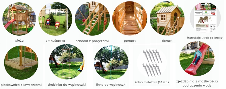 - Детская площадка полностью изготовлена из сушеной древесины сосны и ели.