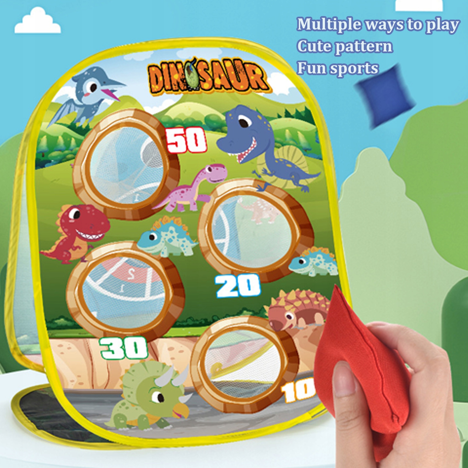 1, двусторонний дизайн: доска для метания мешков с песком и доска для стрельбы липким мячом в одной, легко вращается, два способа игры, бесплатный опыт. 2. Умная игра: откройте игру с мешком с песком, по очереди бросайте и сравнивайте, кто кладет сетчатый мешок, чтобы мобилизовать детский энтузиазм. 3. Несколько целей: нажмите, чтобы сохранить очки, соберите несколько колец, чем ближе к центру, тем выше счет. Создайте четыре кармана для сеток, каждая сетка имеет соответствующее количество очков, ударьте, чтобы набрать очко. 4. Прочный крючок и петля: легко собрать, добавьте ремешок с крючком и петлей к задней части метательной доски, комбинацию можно легко наклеить, чтобы повысить интерес детей. 5. Рисунок динозавра из мультфильма: нарисованные милые маленькие динозавры и природная среда на доске для метания, яркие и интересные. 6. Крепление для гвоздей для палатки: оснащено 4 гвоздями для палатки, легко прикрепите доску для метания во время игры на открытом воздухе. 7. Большая сумка для хранения: метательную доску можно отсоединить и сложить. Его можно хранить в сумке с мешками с песком, липкими шариками и гвоздями для палатки, что позволяет легко выходить на улицу и играть. 8. Сцены использования: дети могут играть на полу, во дворе, на лужайке, на пляже или во время путешествия. Благодаря уникальному и инновационному дизайну эта игра в метание подойдет детям как в помещении, так и на улице.