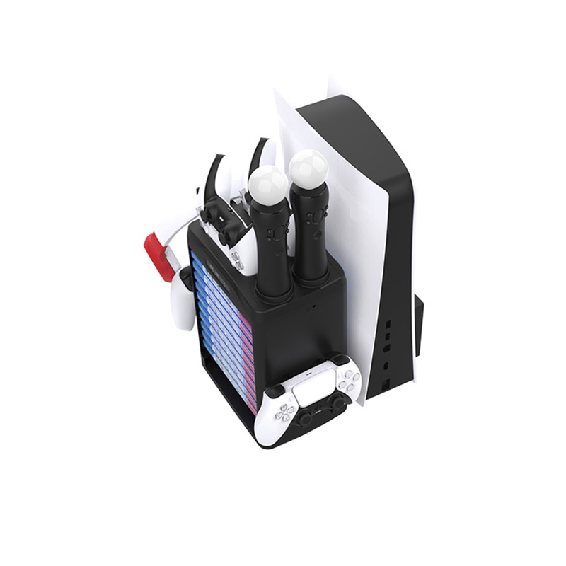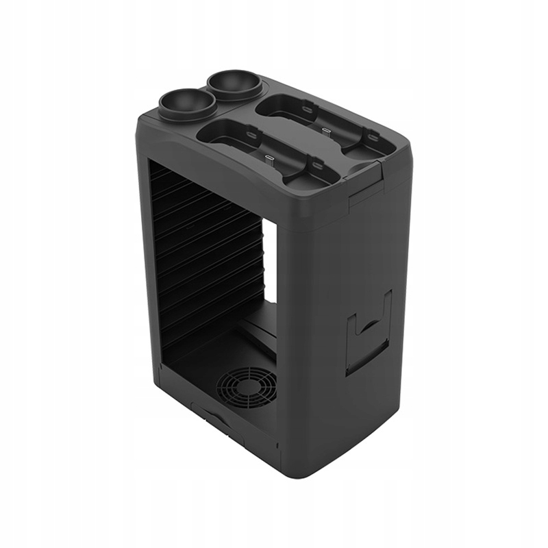 Подставка позволяет разместить консоль PlayStation 5 в вертикальном положении. Это экономит место. Подставка изготовлена из прочного пластика, поэтому ее можно использовать годами. Подставка оснащена вентилятором, охлаждающим консоль. Под подставкой есть резинки для стабилизации консоли. Станция включает в себя 2 док-станции для планшетов и 2 док-станции для контроллеров Move для их зарядки, место для подставки VR, держатель для очков VR, 2 держателя планшетов и подставку на 11 игр. Благодаря светодиодам мы знаем состояние зарядки пэдов и Move.