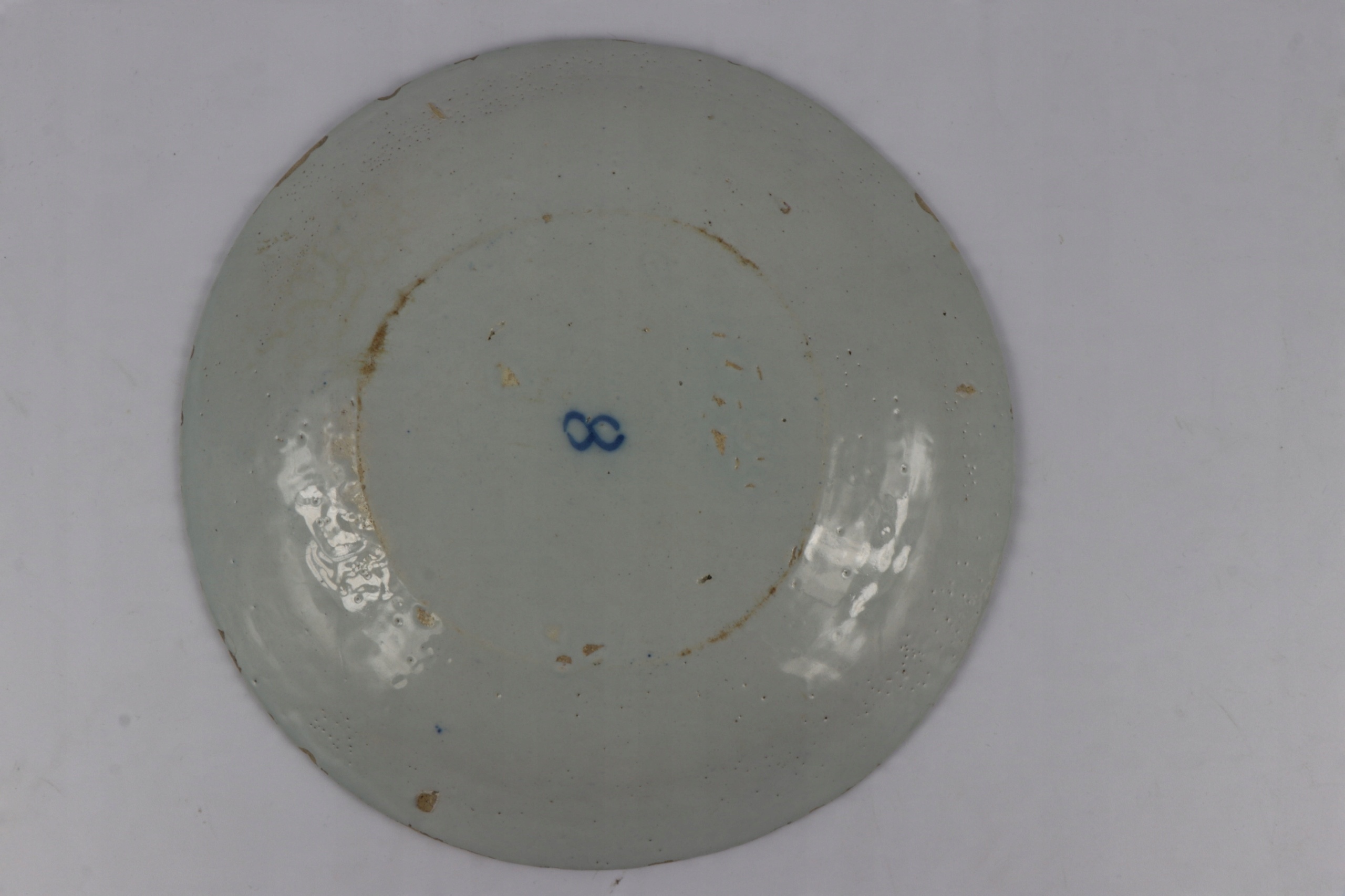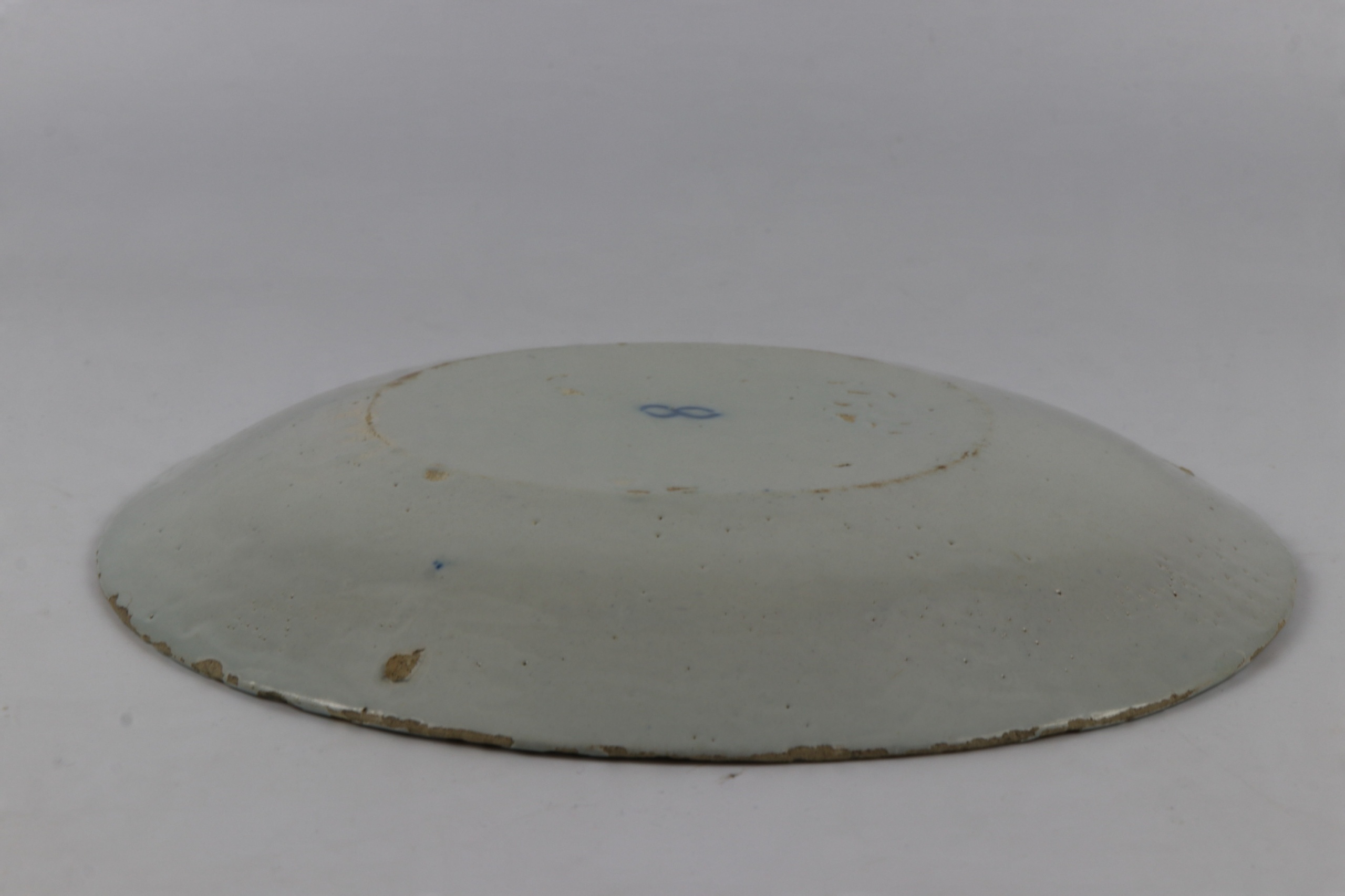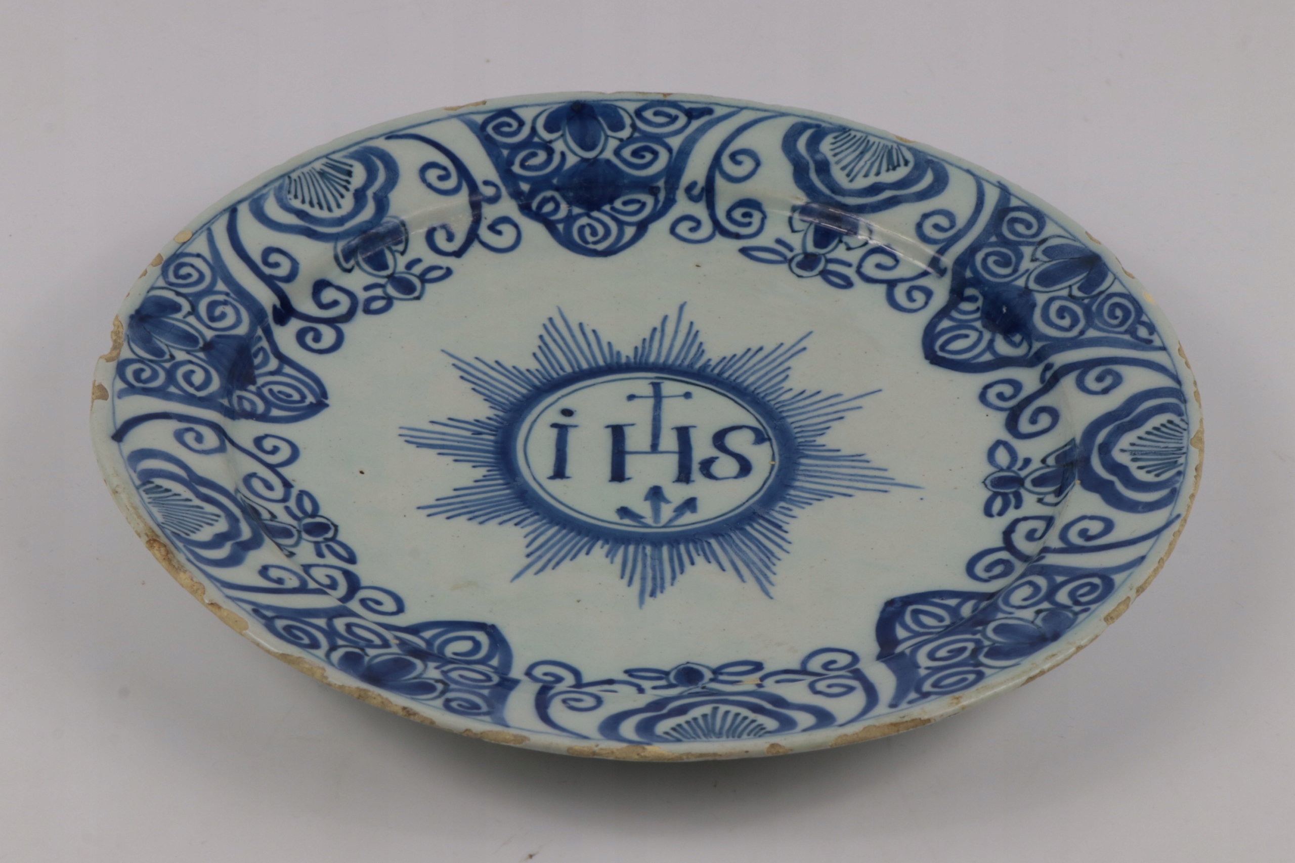 Очень старая фаянсовая тарелка 17-18 веков со знаком IHS Christogram. Интересный христианский декоративный элемент из керамики, расписанной кобальтом и покрытой соляной глазурью. Возможно, аптекарская тарелка.