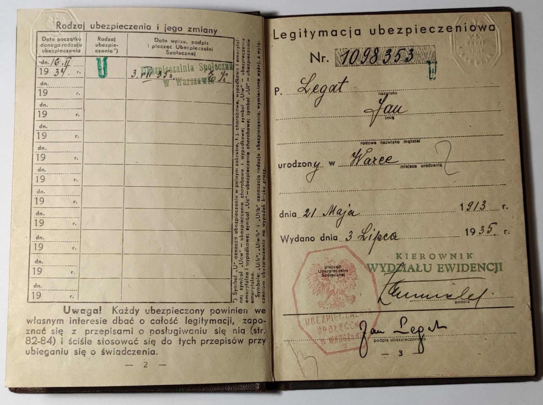 II RP страховой идентификатор 1935 г. Варшава Дж.Л.