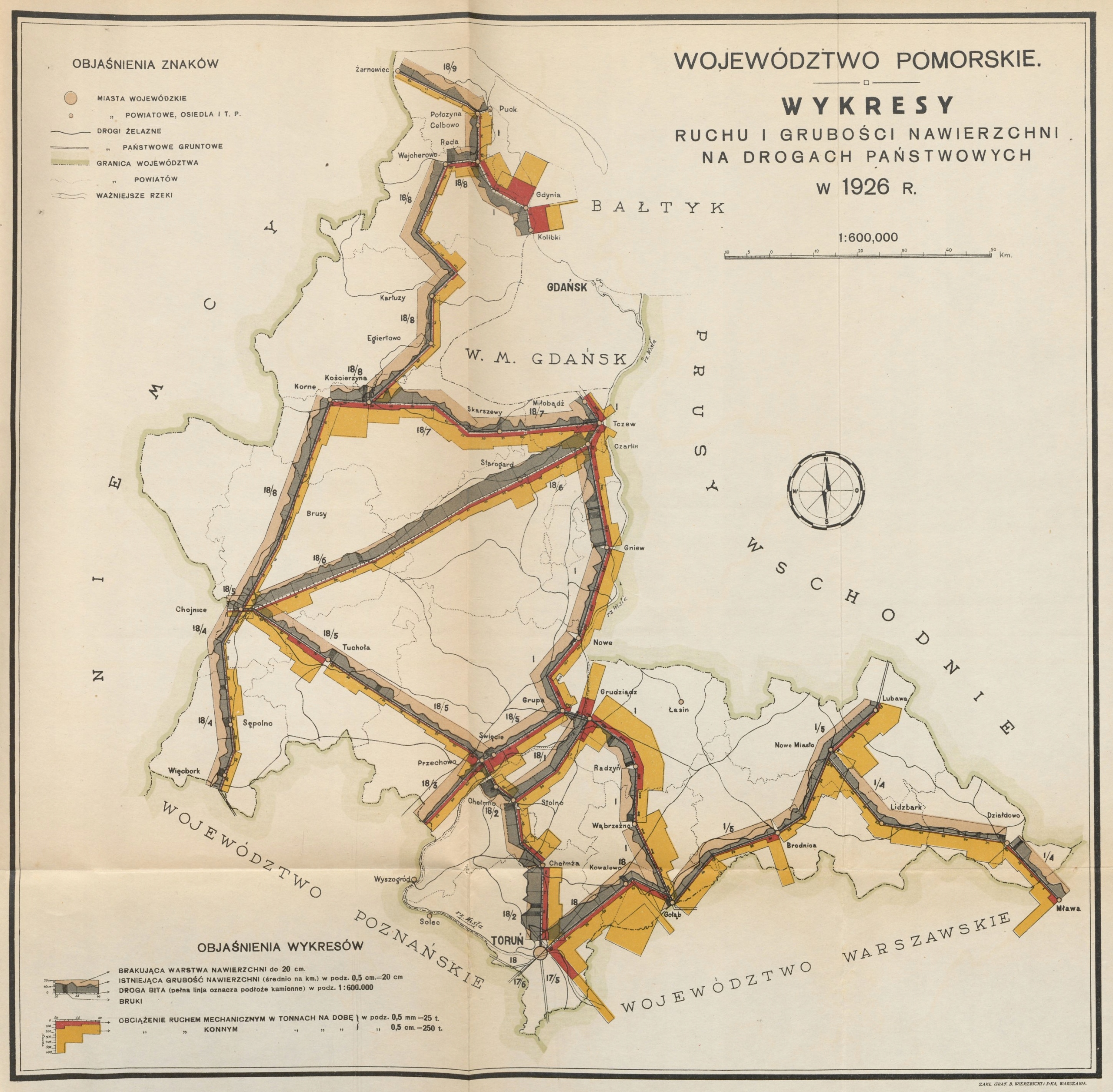 Издание Министерства труда, на 15 картах показано движение транспорта и толщина покрытия на государственных дорогах в следующих воеводствах: Белостокское, Кельце, Краков, Люблин, Львов, Лодзь, Новогрудек, Полесье, Померания, Познань, Станиславов, Тарнополь, Варшава, Вильнюс и Волынь.