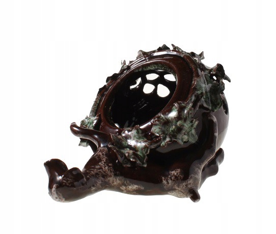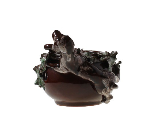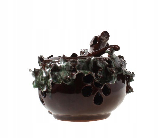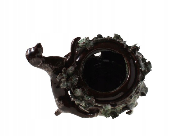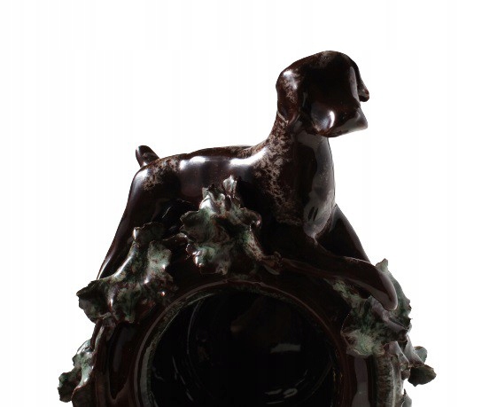 Глазурный сосуд/икебана из красной глины. Верхняя часть чаши украшена мотивом листьев, но ее главным украшением является очень реалистичная фигурка собаки - она похожа на немецкую короткошерстную легаву. Происхождение неизвестно.