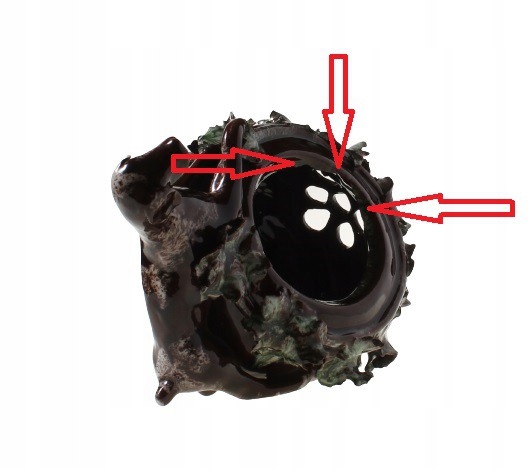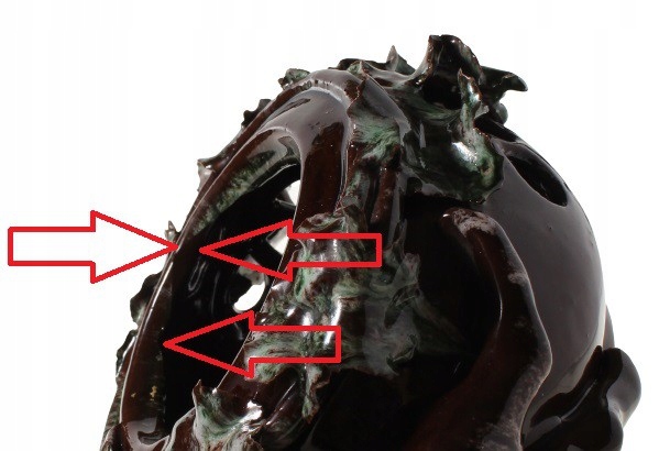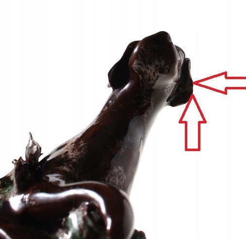 Внутри чисто, без осадка. На нижнем крае верхнего края имеется плоский скол длиной примерно 7 см — видна лишь небольшая его часть. На наружном ухе фигурки собаки две микровмятины примерно по 1-2 мм каждая. Листья без дефектов. Глиняные листья и верхняя кромка (в том месте, где находится скол) достаточно острые. Устойчивое крепление фигурки к кубку.