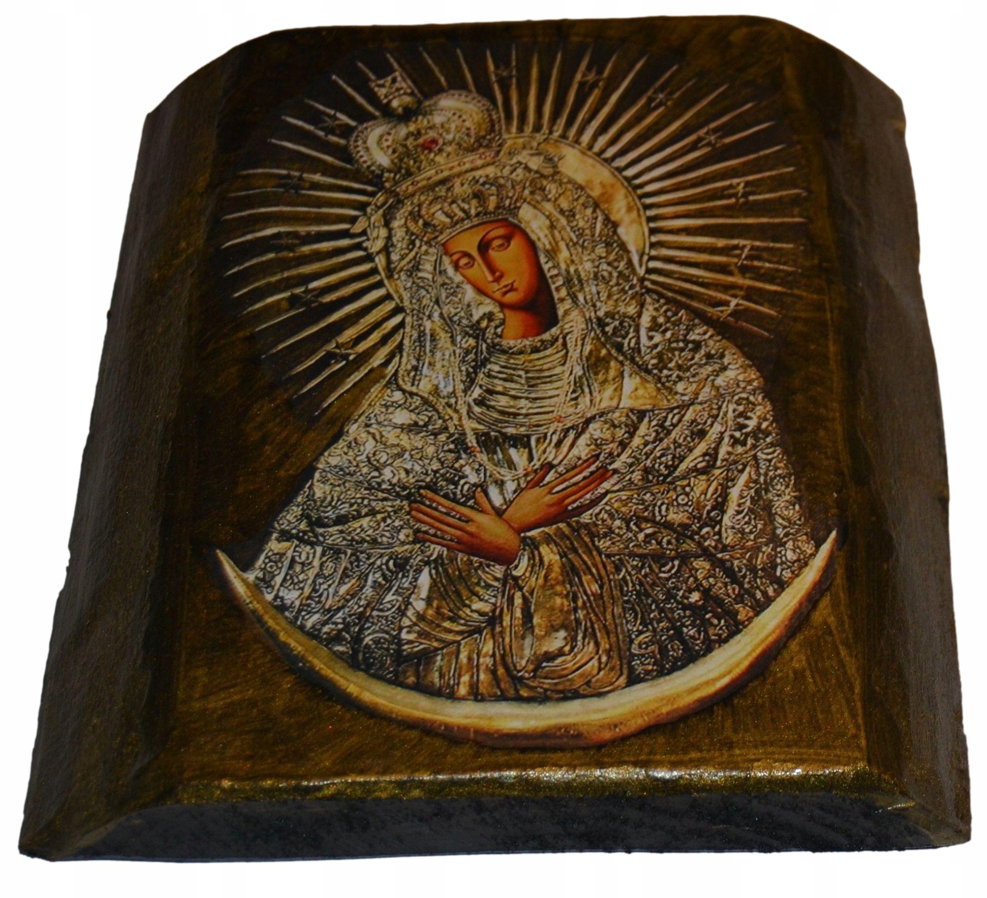 Современная деревянная икона с размерами около 17,5 см х 19,5 см х 2 см ,. Значок, защищенный лаком Shellac и сочетание вашего собственного метода передачи на японской бумаге, позволяет получить интересный эффект приложения изображения. Видимые трещины, неровность, углубления, преднамеренные и целенаправленные сзади, чтобы повесить. По желанию, посвящение, размещенное на обороте с выпуклым облегчением бесплатно.