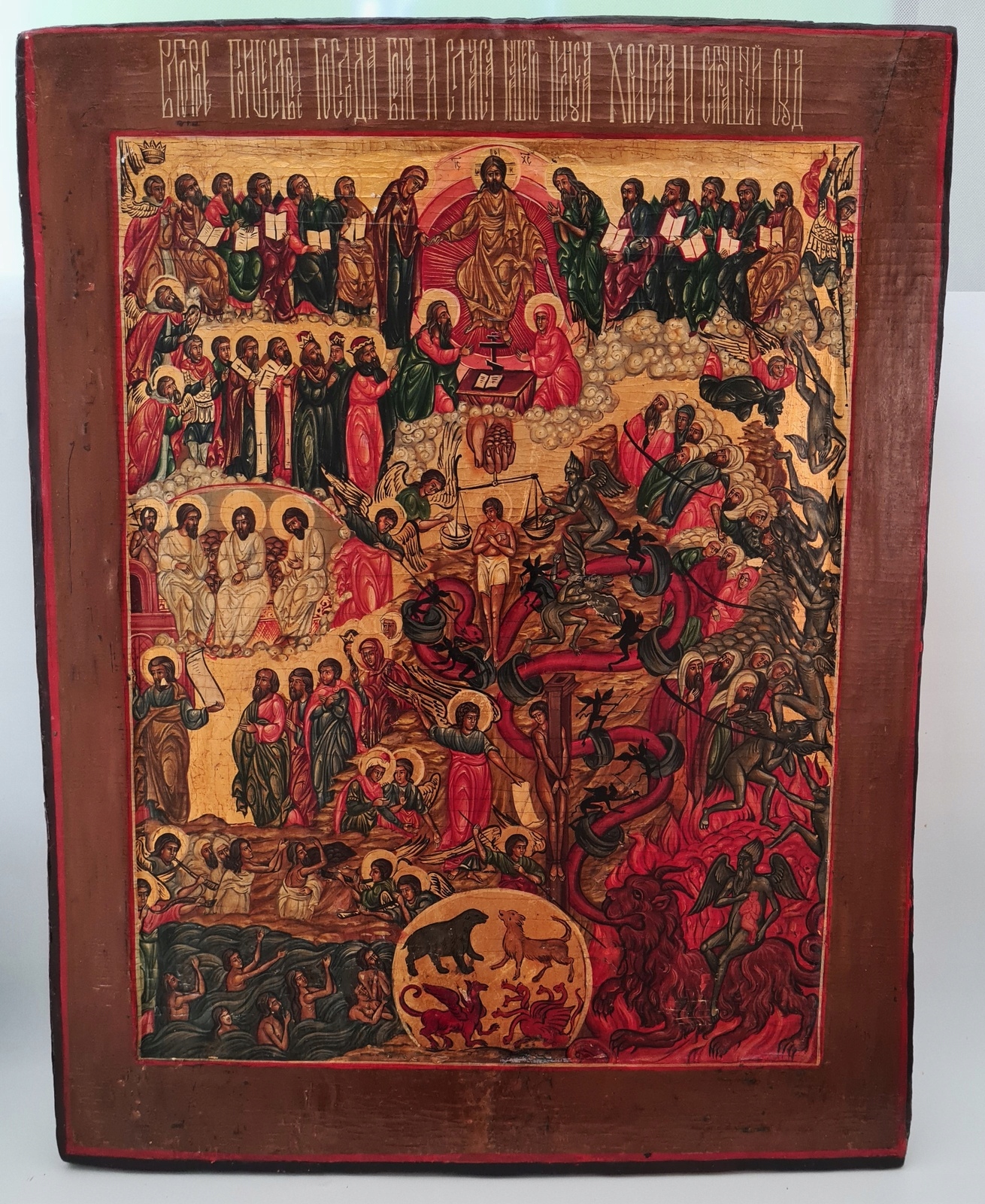 Тема Страшного суда присутствовала с самого начала византийской иконографии и была источником вдохновения для художников. Это последний акт человеческой истории, где Спаситель будет судить живых. Источниками этого представления являются, прежде всего; Апокалипсис святого Иоанна, Книга Бытия, размышления Спасителя об избранных и проклятых, видения пророка Даниила. Вверху изображен Спаситель между Богоматерью и Иоанном Крестителем, затем Апостолы с раскрытыми книгами. Внизу престол с Крестом – Этимасией, на котором воссядут Иисус Христос, Адам и Ева, слева – Святые, Пророки и цари Ветхого Завета. Затем видна рука, взвешивающая души на весах. Внизу, с левой стороны, показан рай и процессия праведников, направляющаяся к райским вратам, где изображены «лоно Авраамово» и добрый разбойник с крестом в руках. С правой стороны изображен ад, вверху ангел, который бросает грешников в огненное море, внизу идет вечная борьба за человеческие души, демоны хватают их и стараются всеми силами затащить в ад, представители Небесное Воинство сразится с ними. Внизу Сатана с душой Иуды на плече едет на адском звере. Слева в центре по кругу изображены четыре царства, обреченные на уничтожение в виде фантасмагорических животных: медведь (Вавилон), лев (Персия), грифон (Македония) и семиглавое рогатое чудовище ( Рим).