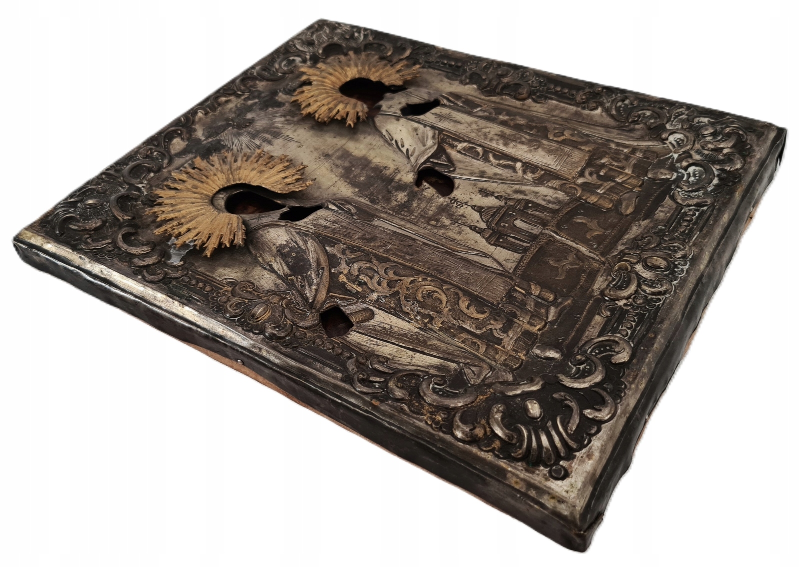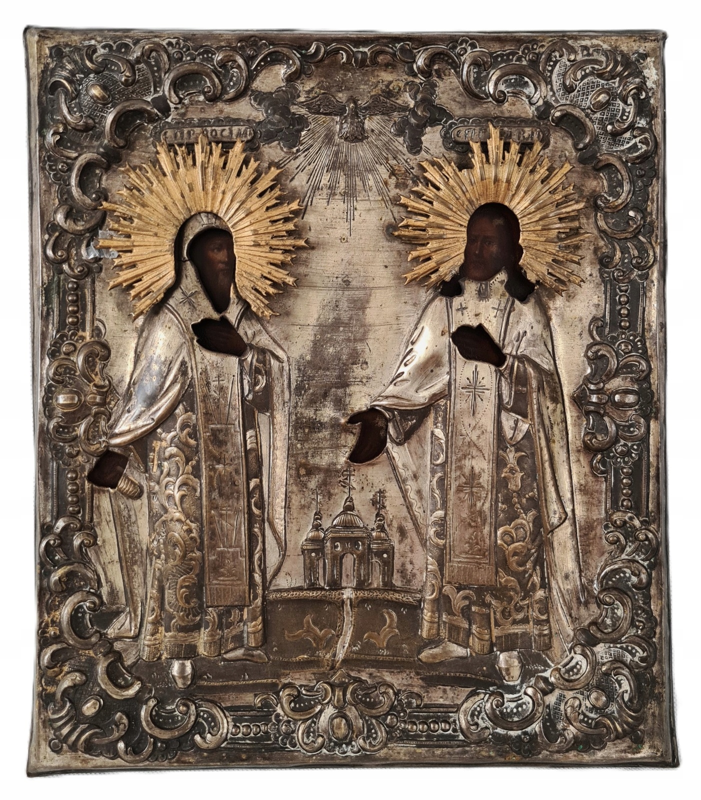 Рудение иконы - латунное посеребренное, с каймой с мотивами в духе рококо: рокайль, акант, стилизованные ракушки, драпированные одежды. Лучевые нимбы из латуни, вверху, в отдельных полях, пояснительные надписи святительской кириллицей.