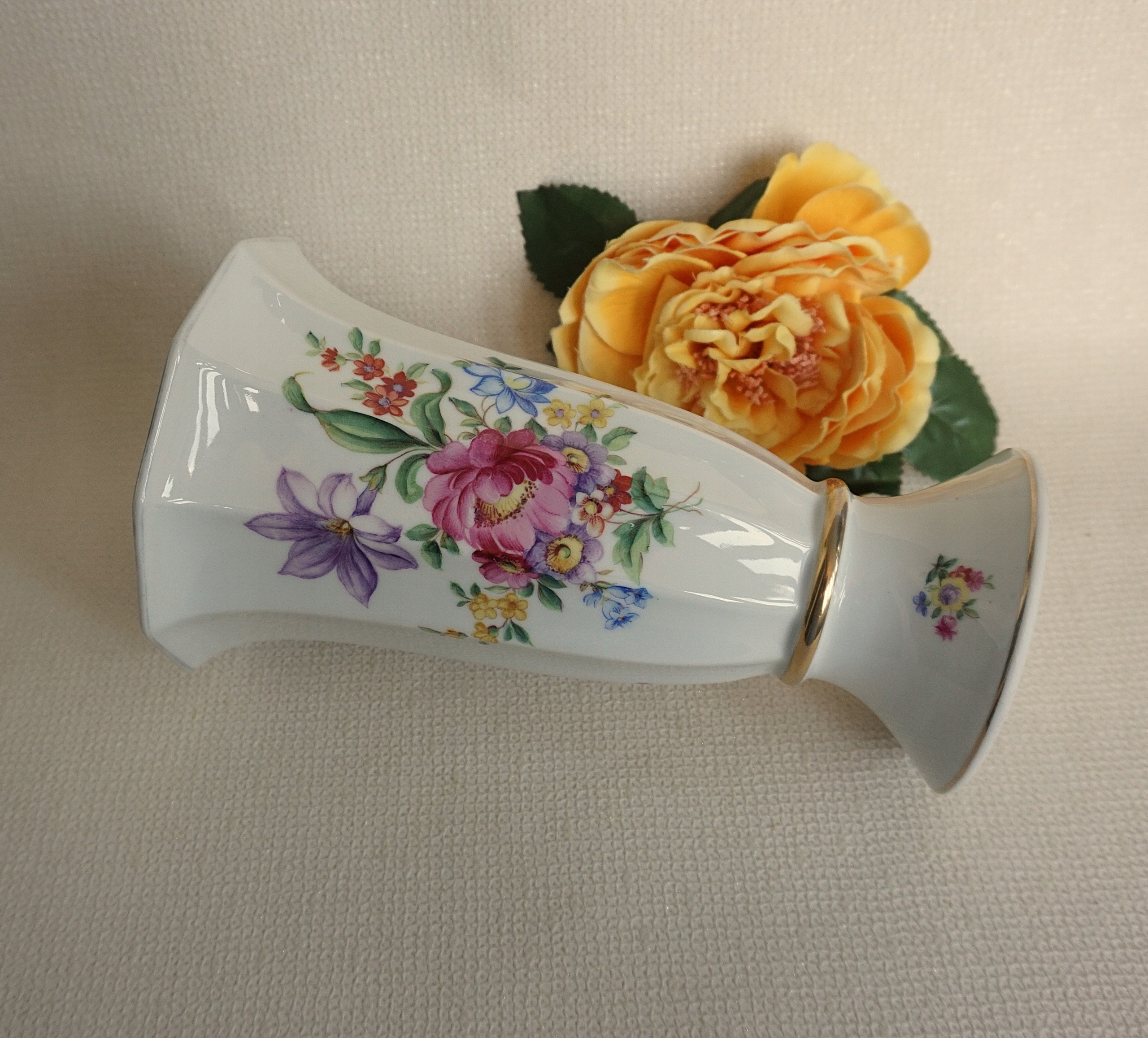 Гладкий фарфор, блестящий. Изысканная форма с эффектно профилированным животом. Двустороннее украшение мотива красочных букетов. Целое возведено на стройной ноге. Может показаться, что верхний край был когда -то позолочен. Даже если это было так, эта позолота исчезла.