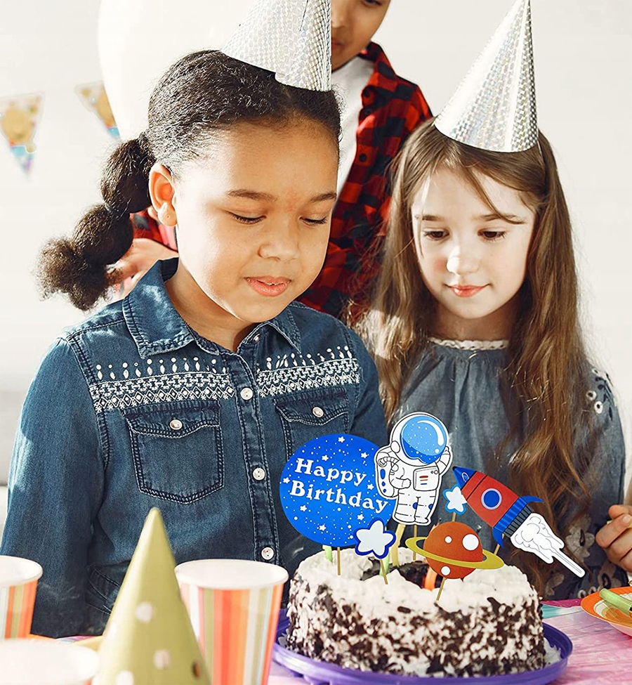 Сладкий фуршет на день рождения — одно из самых популярных мест для детей. Поэтому стоит позаботиться о привлекательном оформлении этого места. Набор топперов из коллекции КОСМОС – чудесное и необычное украшение для торта или другой выпечки.