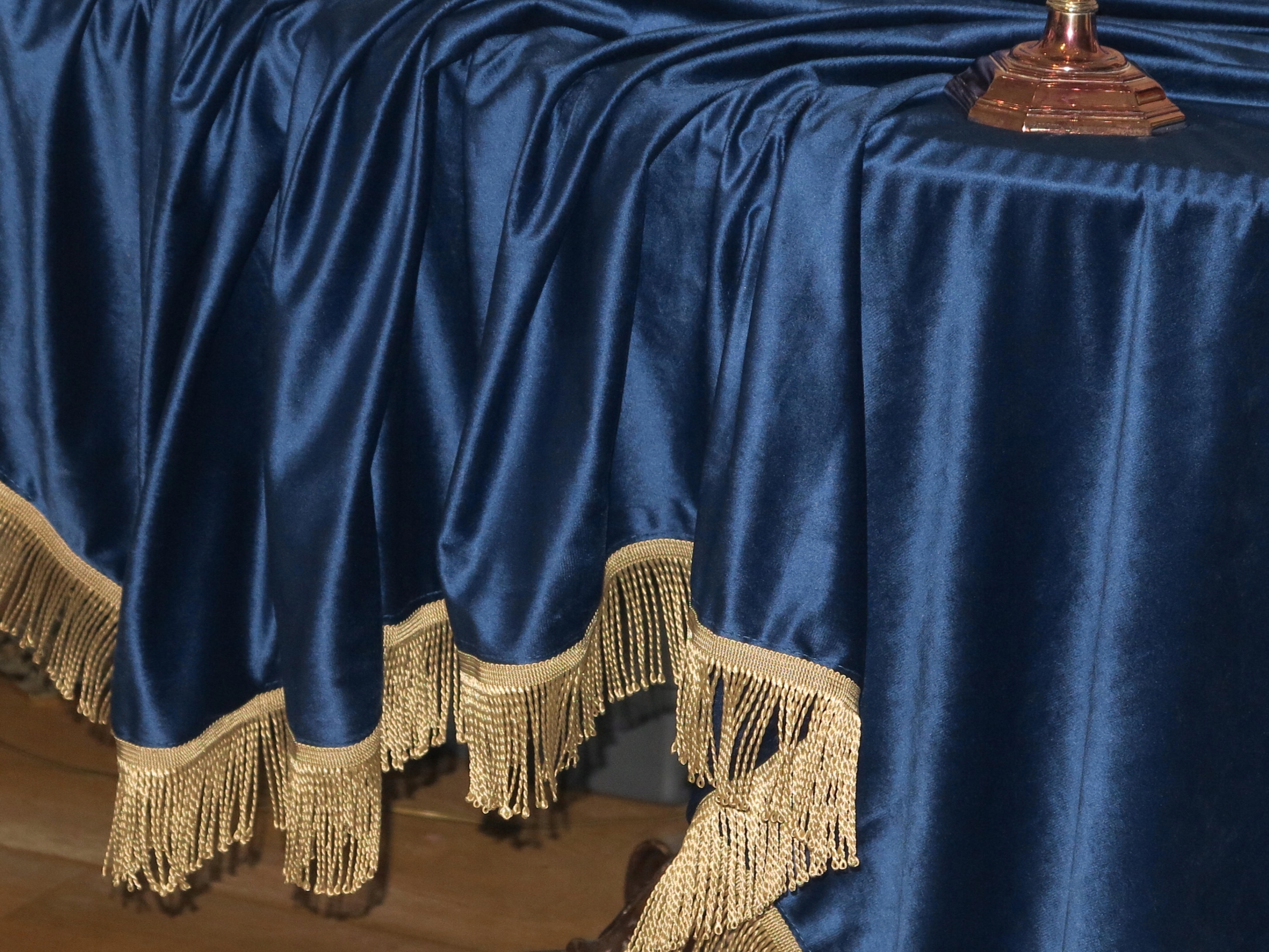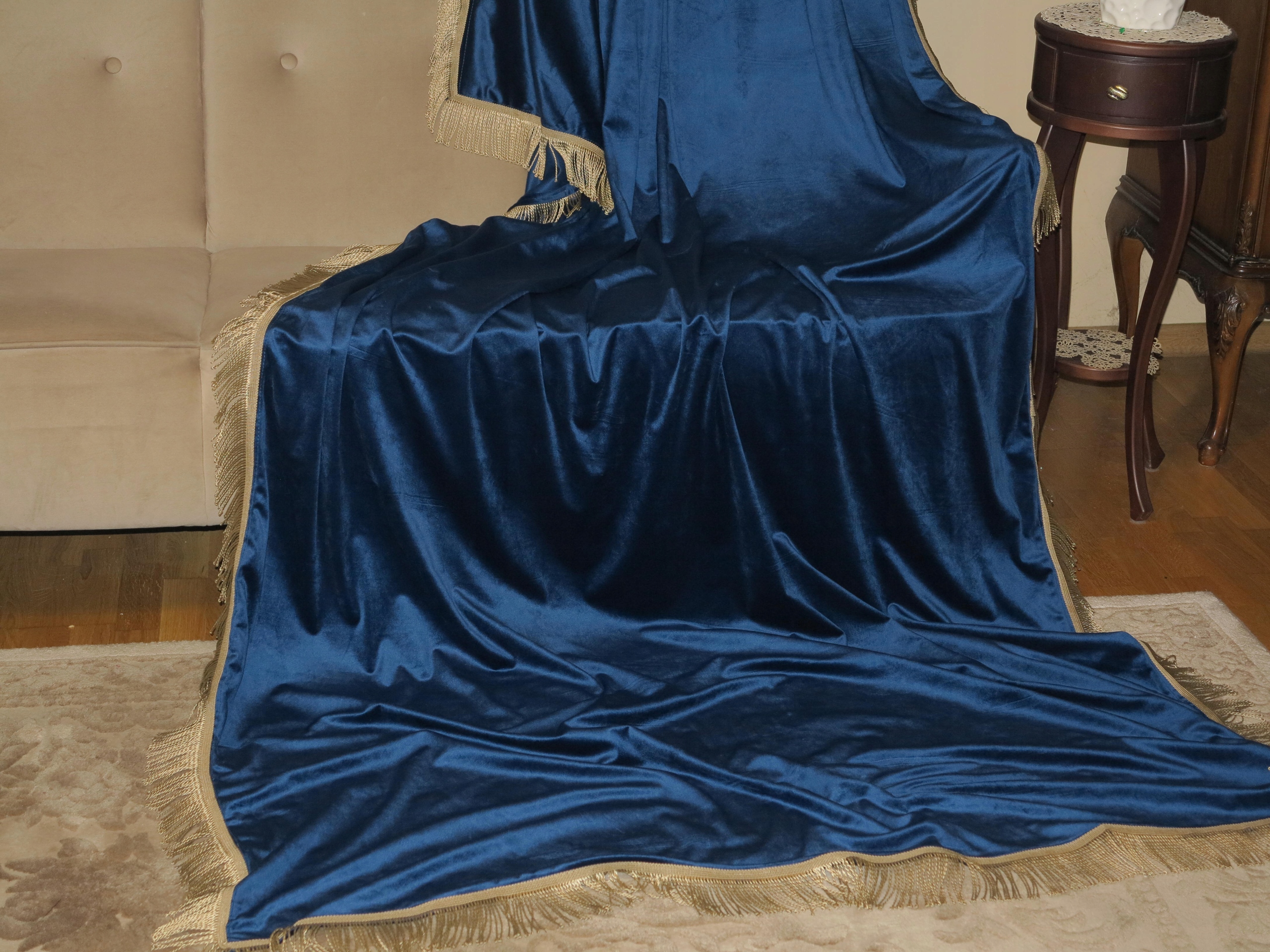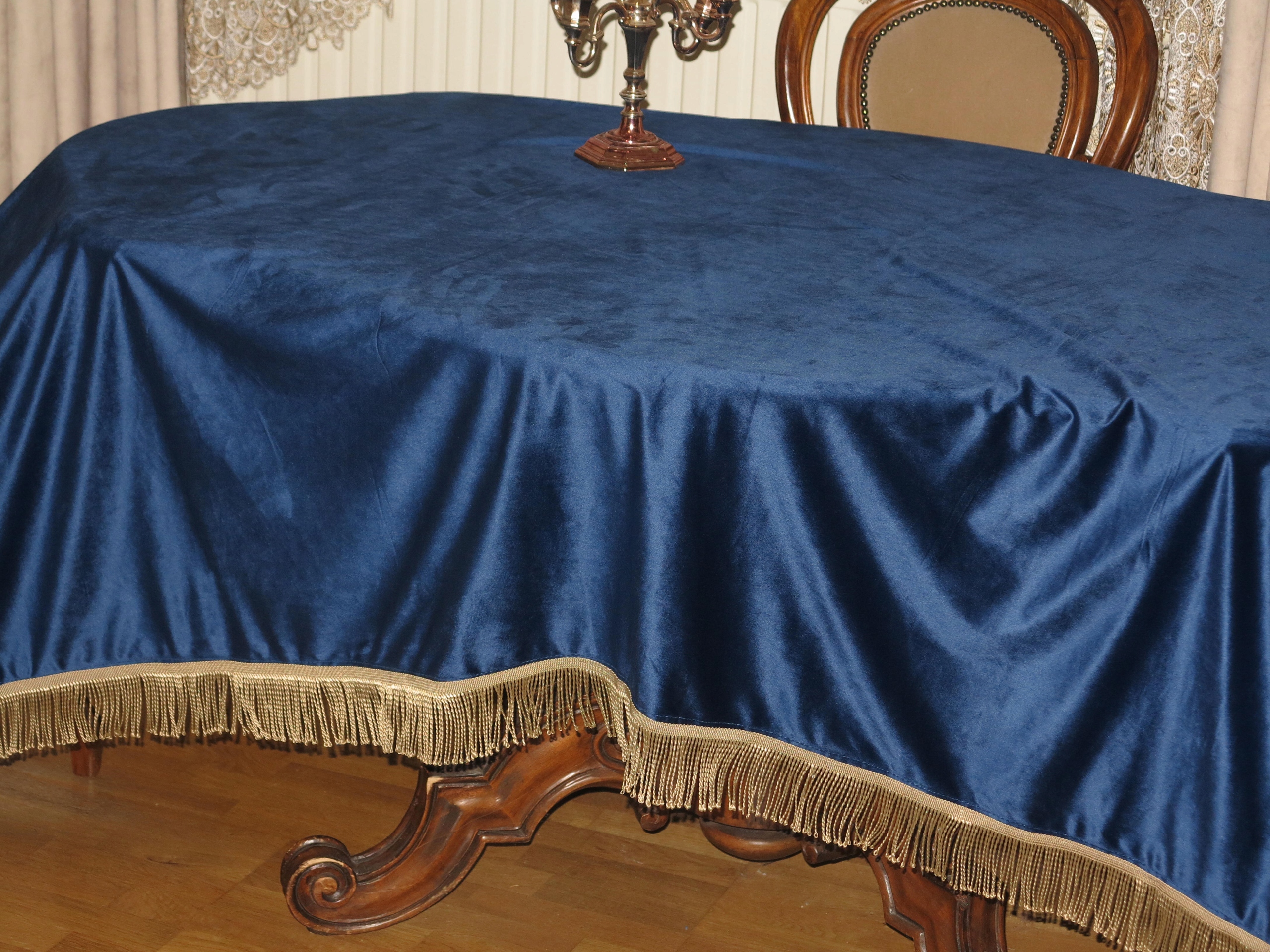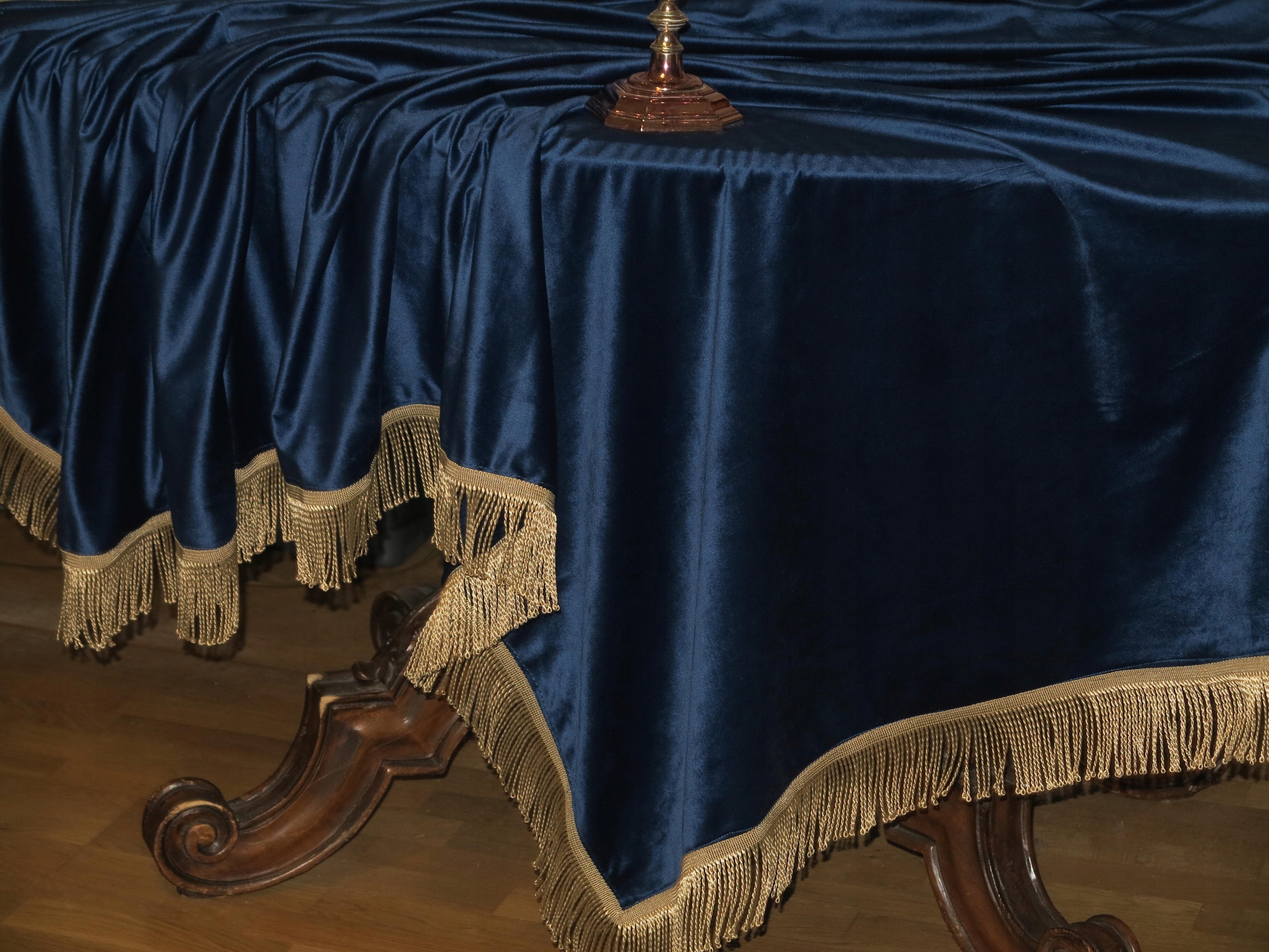 ЗАРЕГИСТРИРОВАННУЮ ОГРОМНУЮ СКАТЕРТЬ ИЗ ТЕЛЯЧЕГО БАРХАТА В ЦВЕТЕ КОБАЛЬТ. СКАТЕРТЬ, УКРАШЕННАЯ ЗОЛОТОЙ БАХОРОЙ.
