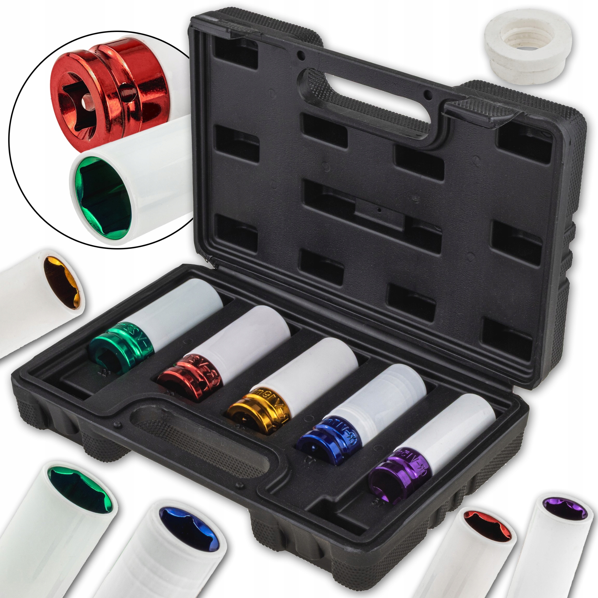 ⭐Профессиональный набор из 5 ударных головок в практичном чемодане. Благодаря защитному покрытию они идеально подходят для работы с легкосплавными дисками, защищая их от царапин и повреждений.