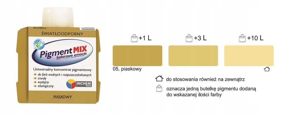 Основное применение – колорирование водорастворимых дисперсионных красок (акриловых, латексных, эмульсионных, меловых). Тщательно подобранный состав концентратов Pigment MIX обеспечивает также возможность окрашивания большинства красок и эмалей на основе растворителей: алкидных (фталевых, масляно-фталевых), хлоркаучука, нитроцеллюлозы.