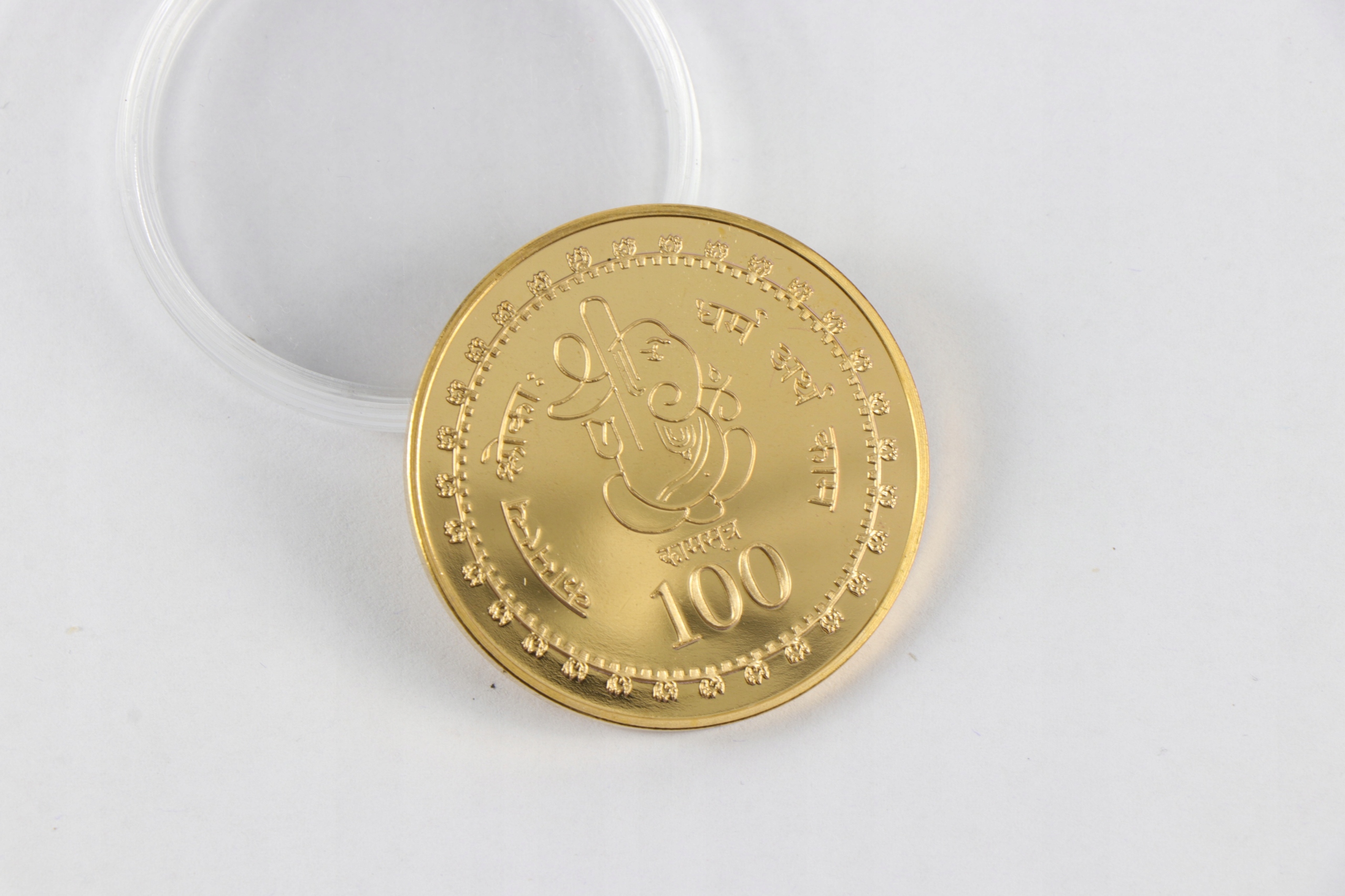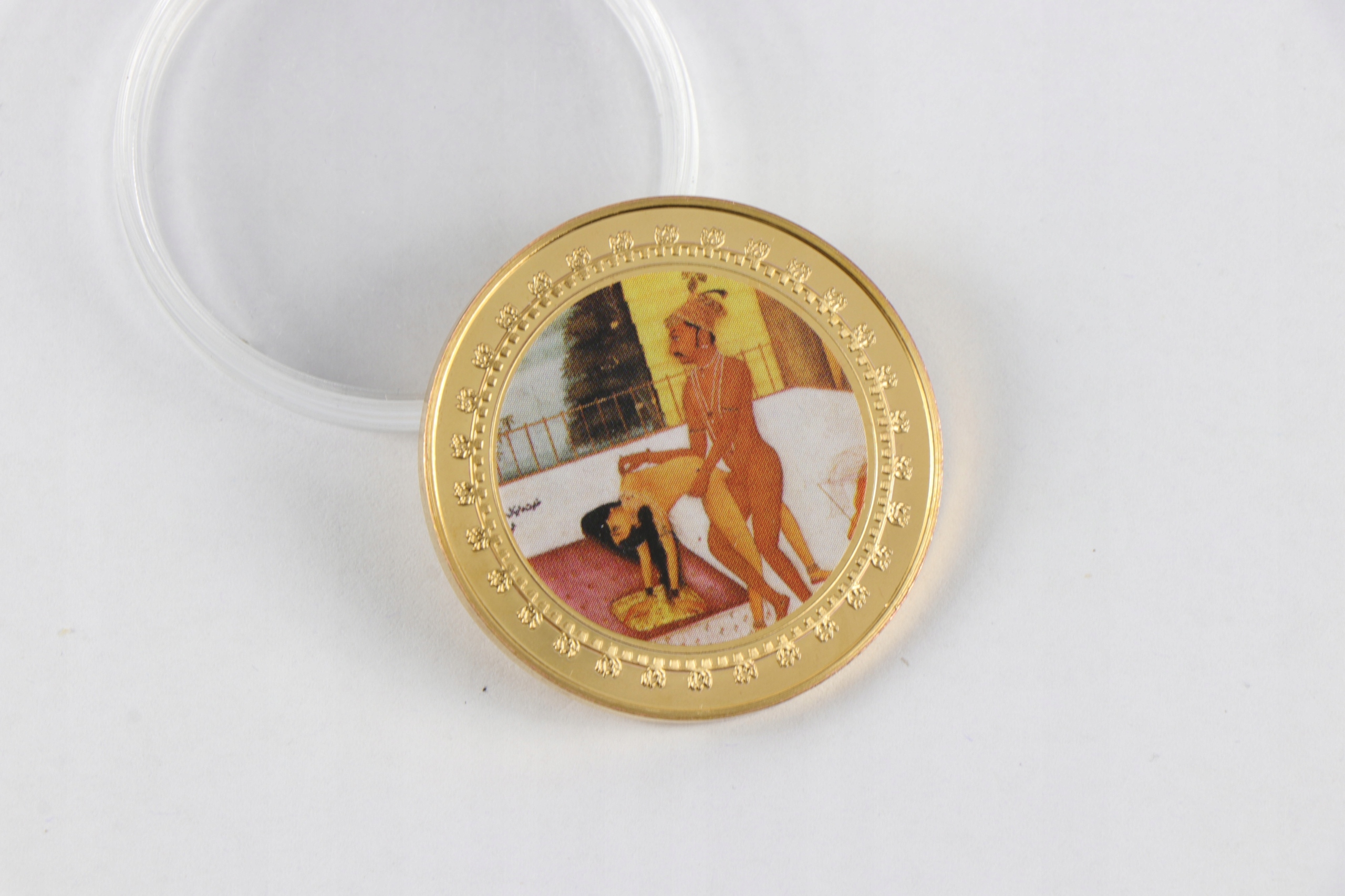 Позолоченная монета из серии «Камасутра» номиналом 100 рупий. Монета упакована в пластиковый футляр.