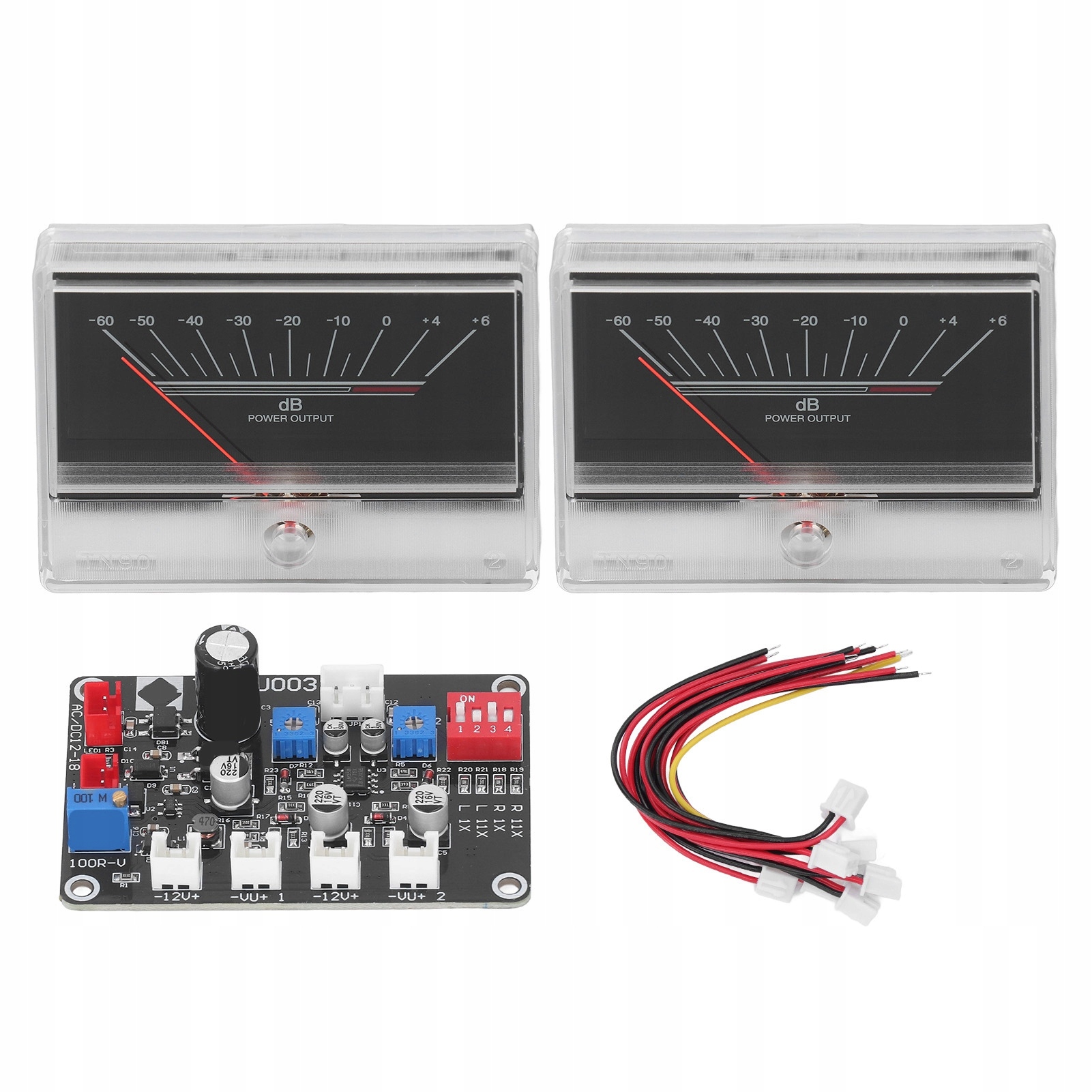 - Источник питания переменного или постоянного тока 12–16 В, необходимо различать входные клеммы переменного и постоянного тока и выходную клемму усилителя мощности для приема сигнала. При подключении L, G и R соответствуют левому, заземленному и правому каналам устройства-источника звука соответственно. Если источником входного аудио является мобильный телефон, звуковая карта компьютера или предусилитель, поверните DIP-переключатели 1 и 3 в положение разъема. Если входом является выходная клемма усилителя мощности, переключите DIP-переключатели 2 и 4 на эту клемму. Сигнал будет сжат в 11 раз и его можно будет регулировать. Потенциометр 100Р-В предназначен для регулировки яркости подсветки измерителя ВУ, а регулируемые потенциометры 50к-1 и 50к-2 регулируют амплитуду биений измерителя 1 и стрелки измерителя ВУ соответственно.