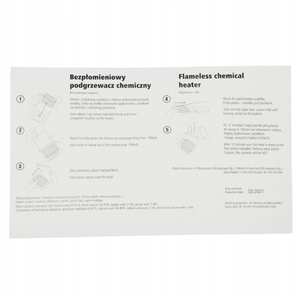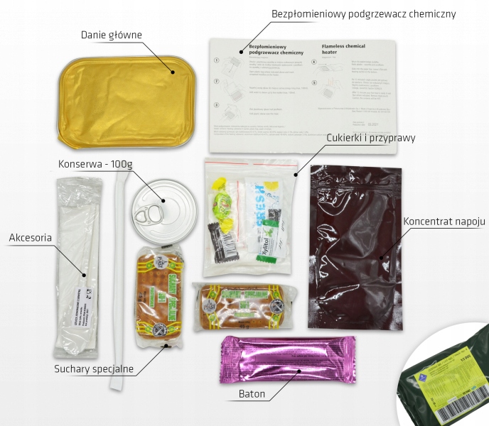 <р>1. Бигос с колбасой 300 г <р>2. Консервы свиные молотые сорта 100 г <р>3. Сухари 90 г <р>4. Клубничный джем 25 г <р>5. Концентрат чайного напитка растворимый со вкусом малины 15 г <р>6. Смесь сублимированных фруктов 15 г <р>7. Зерново-фруктовый батончик со вкусом инжира, 1 шт. <р>8. Жевательная резинка со вкусом мяты 2 шт <р>9. Конфеты с экстрактом натурального кофе 1 шт. <р>10. Конфеты содержащие витамин С 1 шт. <р>11. Специи: соль, перец 1 упаковка <р>12. Крышка пластиковая 1 шт. <р>13. Салфетка 1 шт. <р>14. Салфетка увлажненная 1 шт. <р>15. Туалетная бумага 1 шт. <р>16. Авоська 1 шт. <р>17. Ложка одноразовая 1 шт. <р>18. Питьевая трубочка 1 шт. <р>19. Крючок 2 шт <р>20. Таблетка для обеззараживания питьевой воды, 1 шт. <р>21. Беспламенный химический нагреватель 1 шт.