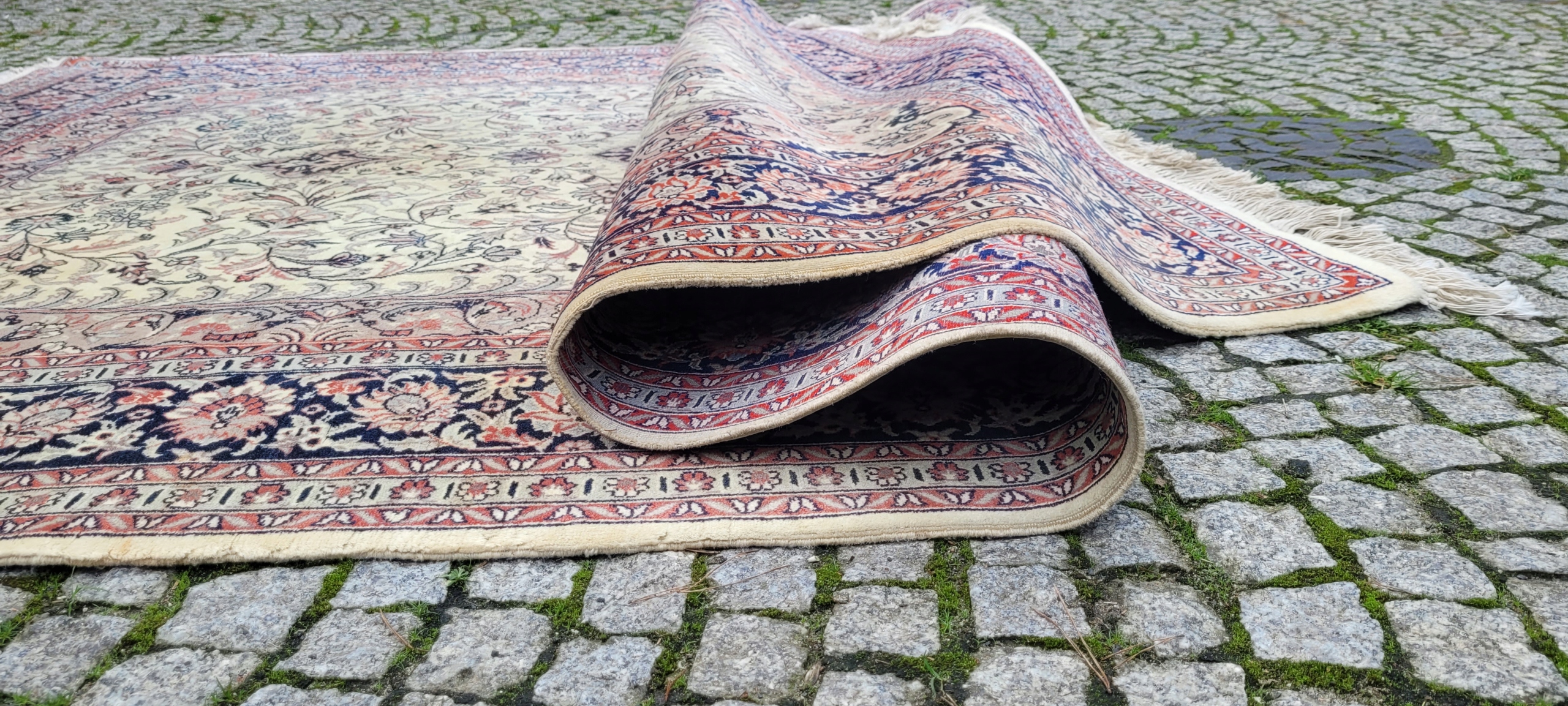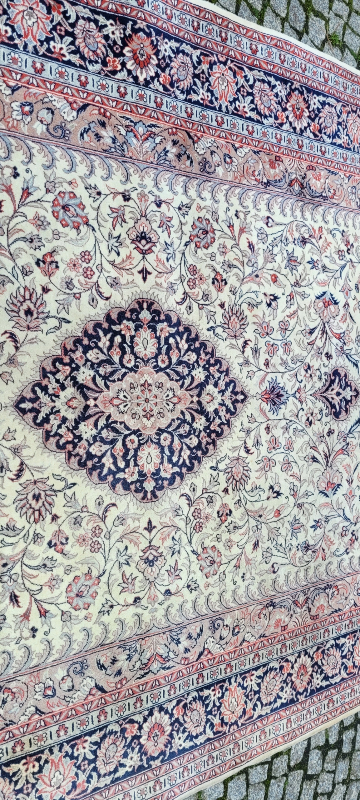 Красивый индийский ковер Керман. Сплетено вручную из шерсти высочайшего качества. Для него характерен компактный, приятный на ощупь, блестящий флис, красивые цвета и узоры. Он достаточно мягкий, но чрезвычайно компактный и тяжелый. Состояние хорошее, видно на фотографиях.